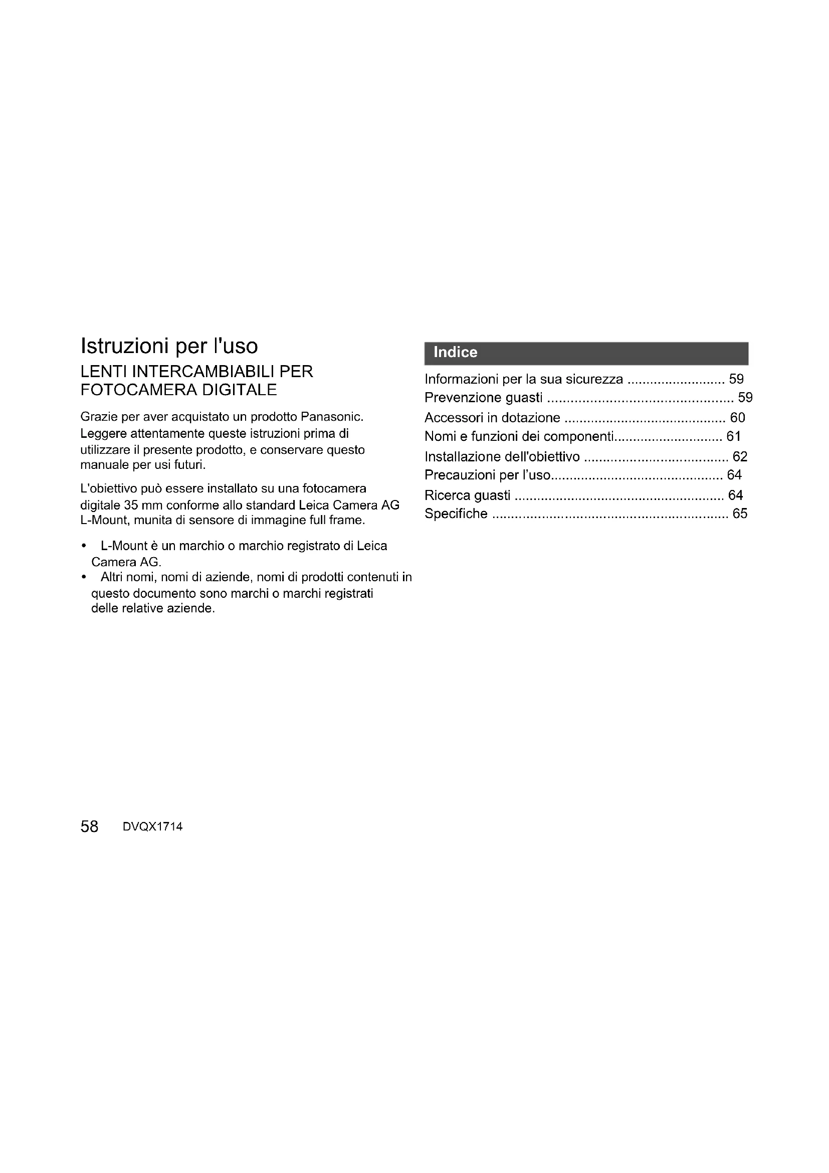 - FOTOCAMERA DIGITALE Grazie per aver acquistato un prodotto Panasonic. Leggere attentamente queste istruzioni prima di utilizzare il presente prodotto, e conservare questo manuale per usi futuri. L'obiettivo può essere installato su una fotocamera digitale 35 mm conforme allo standard Leica Camera AG L-Mount, munita di sensore di immagine full frame. 0 L-Mount è un marchio o marchio registrato di Leica Camera AG. 0 Altri nomi, nomi di aziende, nomi di prodotti contenuti in questo documento sono marchi o marchi registrati delle relative aziende. Informazioni per la sua sicurezza p. 59