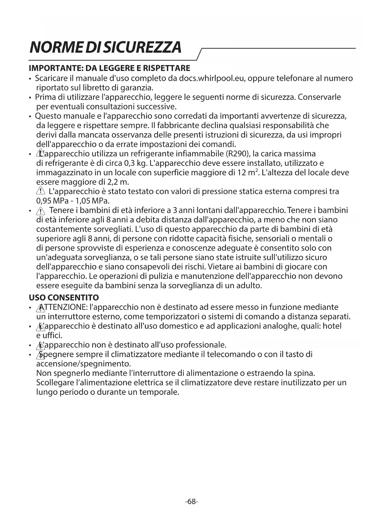 - Per istruzioni dettagliate sulle procedure di installatione, assistenza, manutenzione e riparazione dell'apparecchio, scaricare il manuale completo da docs.whirlpool.eu.