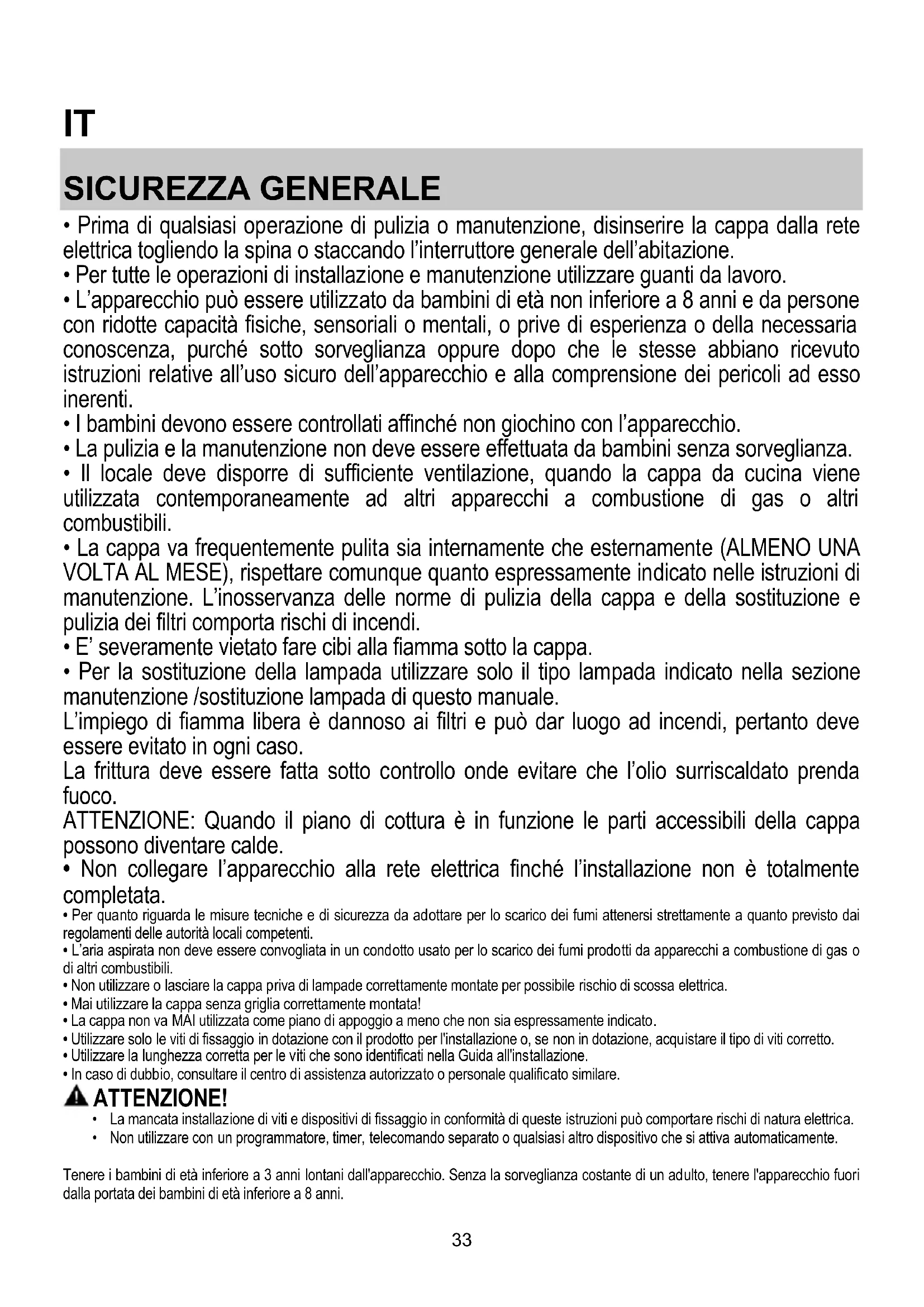 - Per la sostituzione della lampada utilizzare solo il tipo lampada indicato nella sezione manutenzione /sostituzione lampada di questo manuale. L’impiego di fiamma libera è dannoso ai filtri e può dar luogo ad incendi, pertanto deve essere evitato in ogni caso. La frittura deve essere fatta sotto controllo onde evitare che l’olio surriscaldato prenda fuoco. ATTENZIONE: Quando il piano di cottura è in funzione le parti accessibili della cappa possono diventare calde.