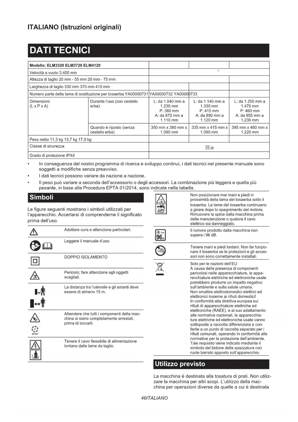 - Il peso può variare a seconda dell’accessorio o degli accessori. La combinazione più leggera e quella più pesante, in base alla Procedura EPTA 01/2014, sono indicate nella tabella. Simboli Legureseguentimostranoisimboliutilizzatiper l’apparecchio.Accertarsidicomprenderneilsignicato prima dell’uso. Adottare cura e attenzione particolari. Leggere il manuale d’uso. DOPPIO ISOLAMENTO Pericolo; fare attenzione agli oggetti scagliati. La distanza tra l’utensile e gli astanti deve essere di almeno 15 m. Attendere che tutti i componenti della mac- china si siano completamente arrestati, prima di toccarli. Tenereilcavoessibiledialimentazione lontano dalle lame da taglio. Non posizionare mai mani e piedi in prossimità della lama del tosaerba sotto il tosaerba. Le lame del tosaerba continuano a girare dopo lo spegnimento del motore. Rimuovere la spina dalla macchina prima della manutenzione o qualora il cavo elettrico sia danneggiato. Il rumore prodotto dalla macchina non supera i 96 dB. Tenere mani e piedi lontani. Non far funzio- nare il tosaerba se le protezioni e gli acces- sori non sono correttamente installati. Solo per le nazioni dell’EU A causa della presenza di componenti pericolosi nelle apparecchiature, le appa- recchiature elettriche ed elettroniche usate potrebbero produrre un impatto negativo sull’ambiente e sulla salute umana. Non smaltire elettrodomestici elettrici ed elettroniciinsiemeairiutidomestici! In conformità alla direttiva europea sui riutidiapparecchiatureelettricheed elettroniche (RAEE), e al suo adattamento alle normative nazionali, le apparecchia- ture elettriche ed elettroniche usate vanno sottopostearaccoltadierenziataecon- ferite a un punto di raccolta separato per i riuticomunali,operandoinconformitàalle normative per la protezione dell’ambiente. Tale requisito viene indicato mediante il simbolo del bidone della spazzatura con ruote barrato apposto sull’apparecchio. Utilizzo previsto Lamacchinaèdestinataallatosaturadiprati.Nonutiliz- zare la macchina per altri scopi. L’utilizzo della mac- chinaperoperazionidiversedaquelleacuièdestinata47 ITALIANO potrebbe risultare in una situazione pericolosa. Alimentazione L’utensile deve essere collegato a una fonte di alimen- tazione con la stessa tensione indicata sulla targhetta del nome, e può funzionare solo a corrente alternata monofase.L’utensileèdotatodidoppioisolamento,per cui può essere utilizzato con prese elettriche sprovviste di messa a terra. Qualora il cavo di alimentazione sia danneggiato, deve essere sostituito dal produttore o da un suo centro di assistenzaalnedievitareunpericolo. Per i sistemi di distribuzione della rete elettrica pubblica a bassa tensione da 220 V a 250 V Le operazioni di accensione e spegnimento degli apparecchielettricicausanouttuazioniditensione. L’utilizzo di questo apparecchio in condizioni avverse dellareteelettricapuòprodurreeettinegativisulfun- zionamento di altri apparecchi. Con un’impedenza della rete elettrica pari o inferiore a 0,425 Ohm (per il modello ELM3720) o 0,427 Ohm (per il modello ELM4120), si puòpresumerechenonsiverichinoeettinegativi.La presa elettrica di rete utilizzata per questo apparecchio deve essere protetta con un fusibile o un interruttore automatico di protezione dotato di caratteristiche di intervento lento. Rumore Standard applicabile : EN IEC 62841-4-3 Modello Livello di pressione sonora Livello di potenza sonora