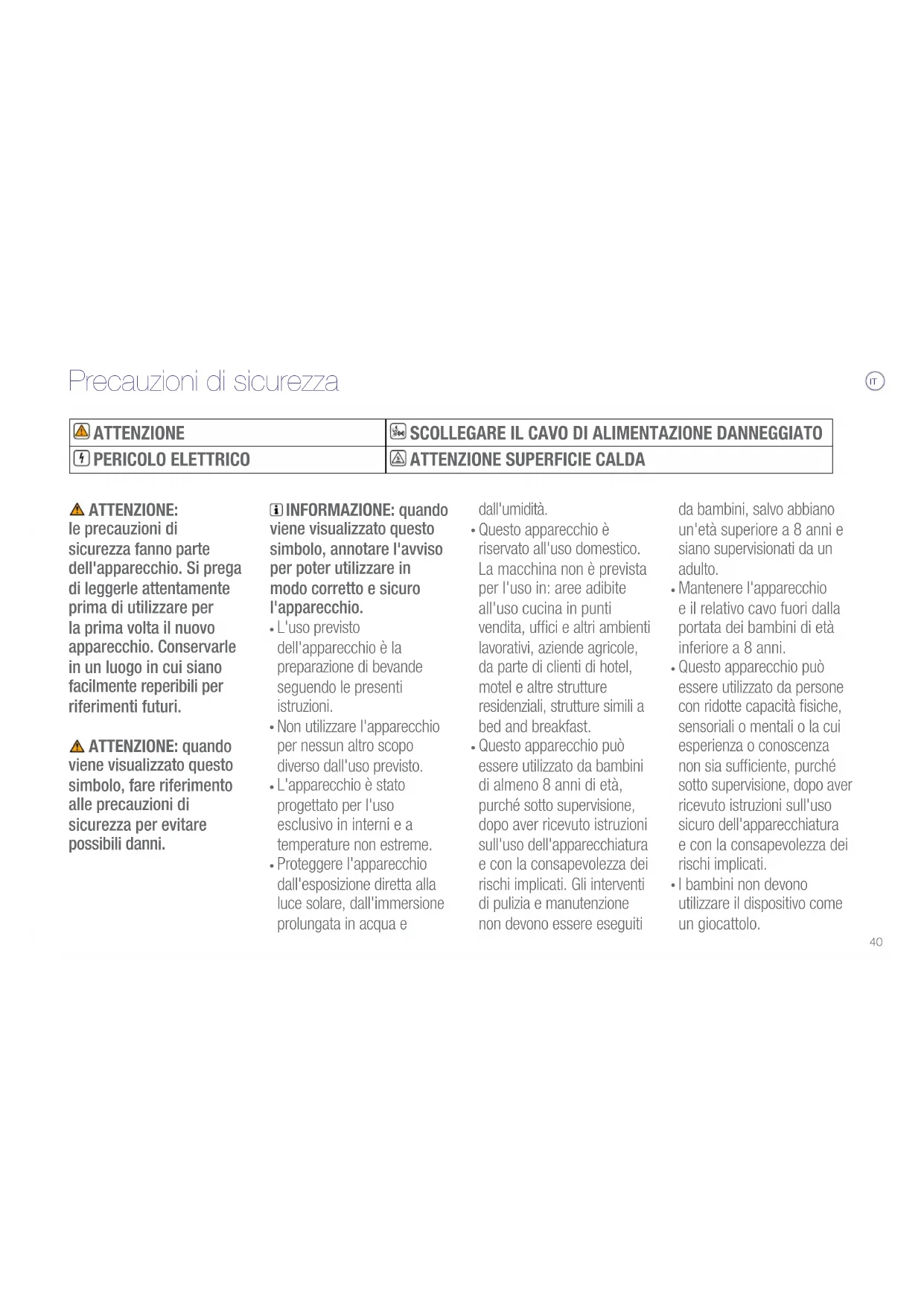 Questo apparecchio può essere utilizzato da bambini di almeno 8 anni di età, purché sotto supervisione, dopo aver ricevuto istruzioni sull'uso dell'apparecchiatura e con la consapevolezza dei rischi implicati. Gli interventi di pulizia e manutenzione non devono essere eseguiti da bambini, salvo abbiano un'età superiore a 8 anni e siano supervisionati da un adulto.