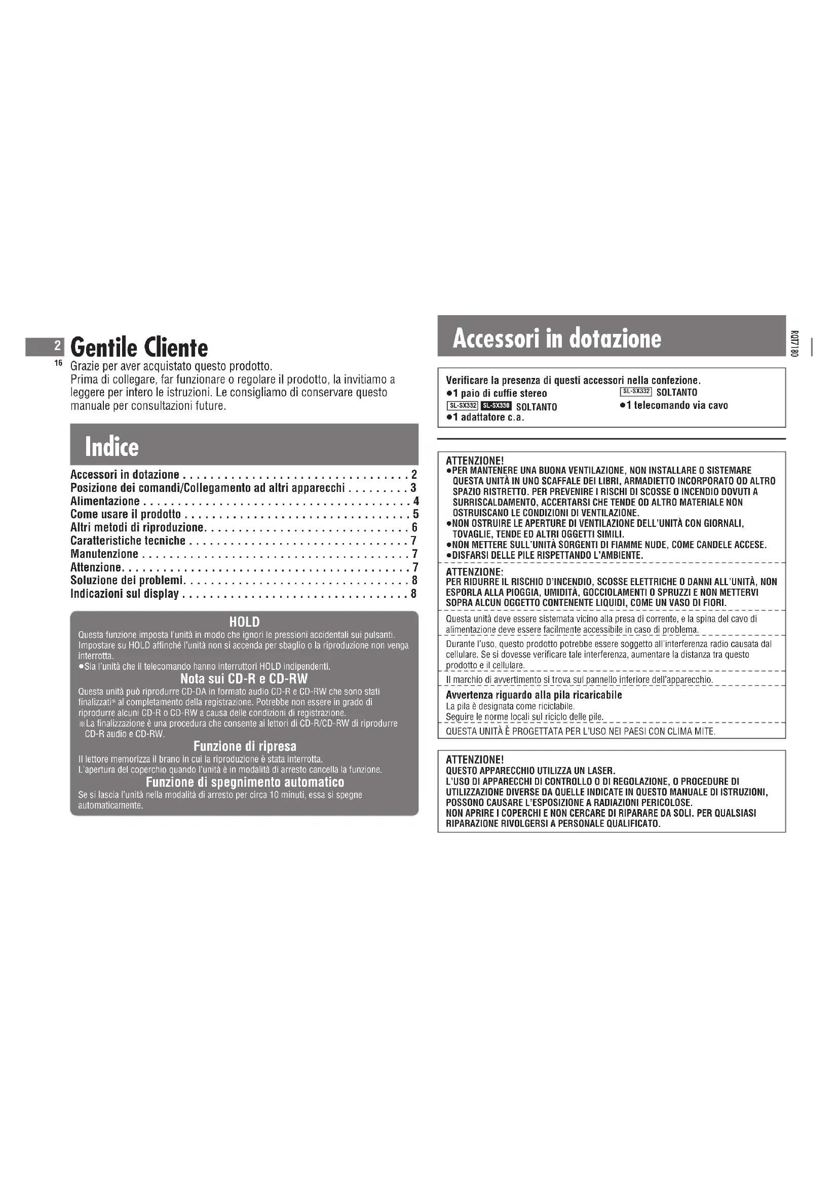 RQT7180 ≥1 paio di cuffie stereo SOLTANTO ≥1 adattatore c.a. SOLTANTO ≥1 telecomando via cavo SL-SX332SL-SX330SL-SX332 Indice Gentile Cliente Grazie per aver acquistato questo prodotto. Prima di collegare, far funzionare o regolare il prodotto, la invitiamo a leggere per intero le istruzioni. Le consigliamo di conservare questo manuale per consultazioni future. HOLD Questa funzione imposta l’unità in modo che ignori le pressioni accidentali sui pulsanti. Impostare su HOLD affinché l’unità non si accenda per sbaglio o la riproduzione non venga interrotta. ≥Sia l’unità che il telecomando hanno interruttori HOLD indipendenti. Nota sui CD-R e CD-RW Questa unità può riprodurre CD-DA in formato audio CD-R e CD-RW che sono stati finalizzati