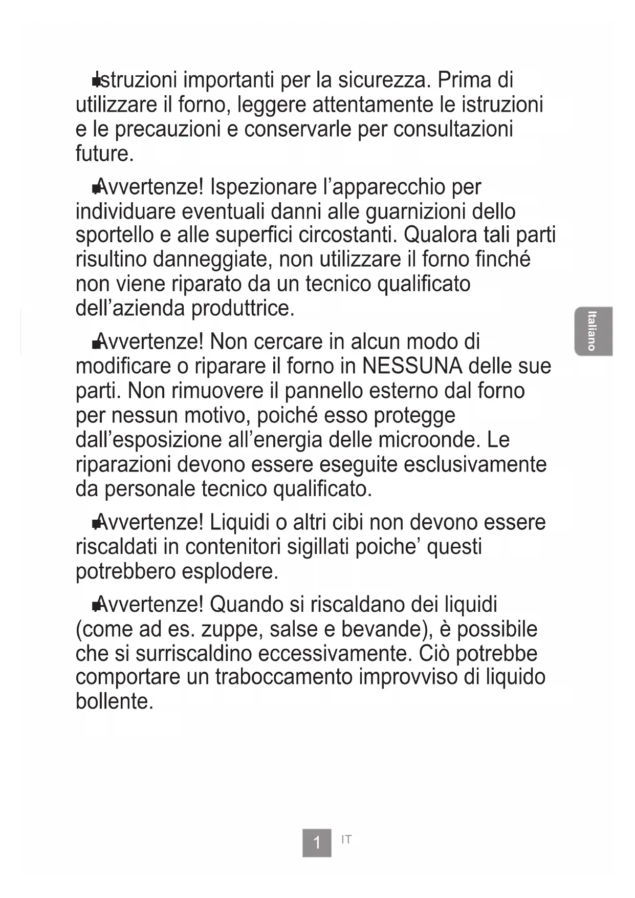 Avvertenze! Liquidi o altri cibi non devono essere riscaldati in contenitori sigillati poiche’ questi potrebbero esplodere.