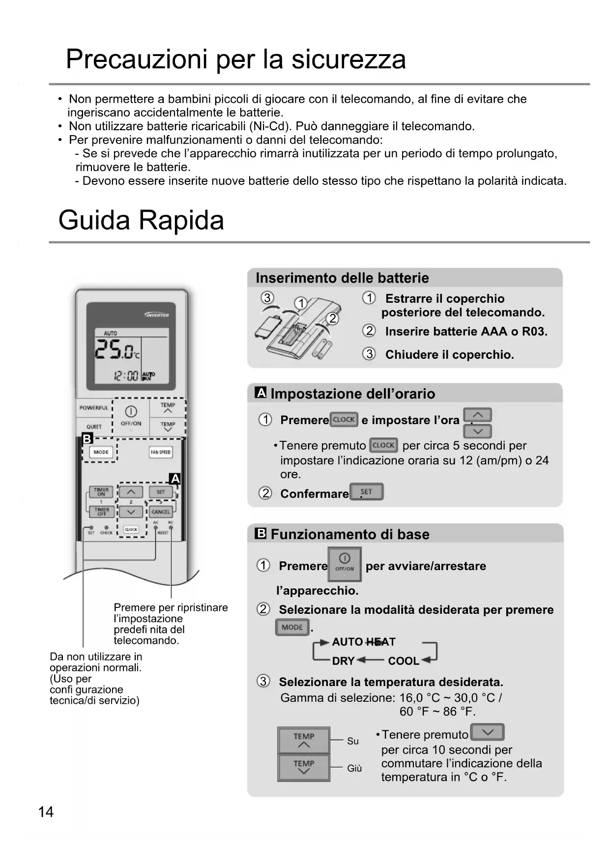 - Tenere premuto per circa 10 secondi per commutare l’indicazione della temperatura in °C o °F. Guida Rapida15 Per regolare la velocità ventola