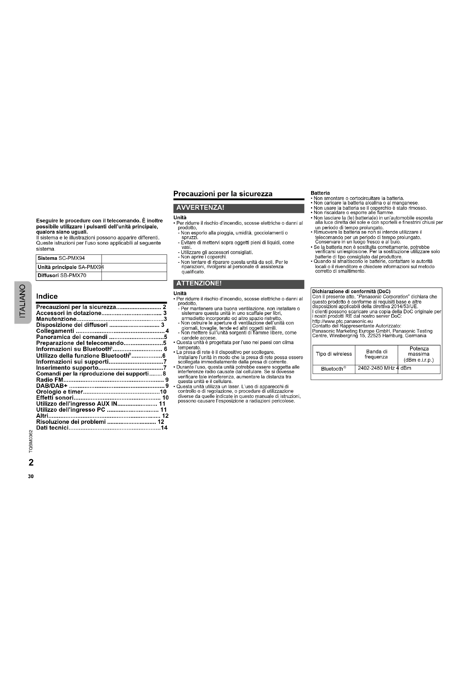- Non smontare o cortocircuitare la batteria.• Non caricare la batteria alcalina o al manganese.• Non usare la batteria se il coperchio è stato rimosso.• Non riscaldare o esporre alle fiamme.• Non lasciare la (le) batteria(e) in un’automobile esposta alla luce diretta del sole e con sportelli e finestrini chiusi per un periodo di tempo prolungato.• Rimuovere la batteria se non si intende utilizzare il telecomando per un periodo di tempo prolungato. Conservare in un luogo fresco e al buio.• Se la batteria non è sostituita correttamente, potrebbe verificarsi un’esplosione. Per la sostituzione utilizzare solo batterie di tipo consigliato dal produttore.• Quando si smaltiscono le batterie, contattare le autorità locali o il rivenditore e chiedere informazioni sul metodo corretto di smaltimento. Sistema SC-PMX94 Unità principale SA-PMX94 Diffusori SB-PMX70 AVVERTENZA! ATTENZIONE! Dichiarazione di conformità (DoC)Con il presente atto, “Panasonic Corporation” dichiara che questo prodotto è conforme ai requisiti base e altre disposizioni applicabili della direttiva 2014/53/UE.I clienti possono scaricare una copia della DoC originale per i nostri prodotti RE dal nostro server DoC:http://www.ptc.panasonic.euContatto del Rappresentante Autorizzato:Panasonic Marketing Europe GmbH, Panasonic Testing Centre, Winsbergring 15, 22525 Hamburg, Germania Tipo di wireless Banda di frequenza Potenza massima (dBm e.i.r.p.) Bluetooth