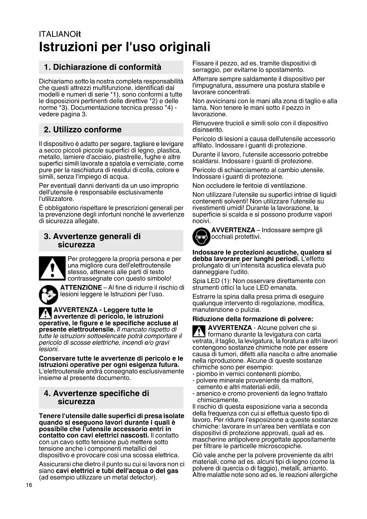 Istruzioni per l'uso originali Dichiariamo sotto la nostra completa responsabilità che questi attrezzi multifunzione, identificati dai modelli e numeri di serie *1), sono conformi a tutte le disposizioni pertinenti delle direttive *2) e delle norme *3). Documentazione tecnica presso *4) - vedere pagina 3. Il dispositivo è adatto per segare, tagliare e levigare a secco piccoli piccole superfici di legno, plastica, metallo, lamiere d'acciaio, piastrelle, fughe e altre superfici simili lavorate a spatola e verniciate, come pure per la raschiatura di residui di colla, colore e simili, senza l'impiego di acqua. Per eventuali danni derivanti da un uso improprio dell'utensile è responsabile esclusivamente l'utilizzatore. È obbligatorio rispettare le prescrizioni generali per la prevenzione degli infortuni nonché le avvertenze di sicurezza allegate. Per proteggere la propria persona e per una migliore cura dell'elettroutensile stesso, attenersi alle parti di testo contrassegnate con questo simbolo! ATTENZIONE – Al fine di ridurre il rischio di lesioni leggere le Istruzioni per l'uso. AVVERTENZA - Leggere tutte le avvertenze di pericolo, le istruzioni operative, le figure e le specifiche accluse al presente elettroutensile. Il mancato rispetto di tutte le istruzioni sottoelencate potrà comportare il pericolo di scosse elettriche, incendi e/o gravi lesioni. Conservare tutte le avvertenze di pericolo e le istruzioni operative per ogni esigenza futura. L'elettroutensile andrà consegnato esclusivamente insieme al presente documento. Tenere l'utensile dalle superfici di presa isolate quando si eseguono lavori durante i quali è possibile che l'utensile accessorio entri in contatto con cavi elettrici nascosti. Il contatto con un cavo sotto tensione può mettere sotto tensione anche i componenti metallici del dispositivo e provocare così una scossa elettrica. Assicurarsi che dietro il punto su cui si lavora non ci siano cavi elettrici e tubi dell'acqua o del gas (ad esempio utilizzare un metal detector). Fissare il pezzo, ad es. tramite dispositivi di serraggio, per evitarne lo spostamento. Afferrare sempre saldamente il dispositivo per l'impugnatura, assumere una postura stabile e lavorare concentrati. Non avvicinarsi con le mani alla zona di taglio e alla lama. Non tenere le mani sotto il pezzo in lavorazione. Rimuovere trucioli e simili solo con il dispositivo disinserito. Pericolo di lesioni a causa dell'utensile accessorio affilato. Indossare i guanti di protezione. Durante il lavoro, l'utensile accessorio potrebbe scaldarsi. Indossare i guanti di protezione. Pericolo di schiacciamento al cambio utensile. Indossare i guanti di protezione. Non occludere le feritoie di ventilazione. Non utilizzare l'utensile su superfici intrise di liquidi contenenti solventi! Non utilizzare l'utensile su rivestimenti umidi! Durante la lavorazione, la superficie si scalda e si possono produrre vapori nocivi. AVVERTENZA – Indossare sempre gli occhiali protettivi. Indossare le protezioni acustiche, qualora si debba lavorare per lunghi periodi. L'effetto prolungato di un'intensità acustica elevata può danneggiare l'udito. Spia LED (1): Non osservare direttamente con strumenti ottici la luce LED emanata. Estrarre la spina dalla presa prima di eseguire qualunque intervento di regolazione, modifica, manutenzione o pulizia. Riduzione della formazione di polvere: AVVERTENZA - Alcune polveri che si formano durante la levigatura con carta vetrata, il taglio, la levigatura, la foratura e altri lavori contengono sostanze chimiche note per essere causa di tumori, difetti alla nascita o altre anomalie nella riproduzione. Alcune di queste sostanze chimiche sono per esempio: - piombo in vernici contenenti piombo, - polvere minerale proveniente da mattoni, cemento e altri materiali edili, - arsenico e cromo provenienti da legno trattato chimicamente. Il rischio di questa esposizione varia a seconda della frequenza con cui si effettua questo tipo di lavoro. Per ridurre l'esposizione a queste sostanze chimiche: lavorare in un'area ben ventilata e con dispositivi di protezione approvati, quali ad es. mascherine antipolvere progettate appositamente per filtrare le particelle microscopiche. Ciò vale anche per la polvere proveniente da altri materiali, come ad es. alcuni tipi di legno (come la polvere di quercia o di faggio), metalli, amianto. Altre malattie note sono ad es. le reazioni allergiche