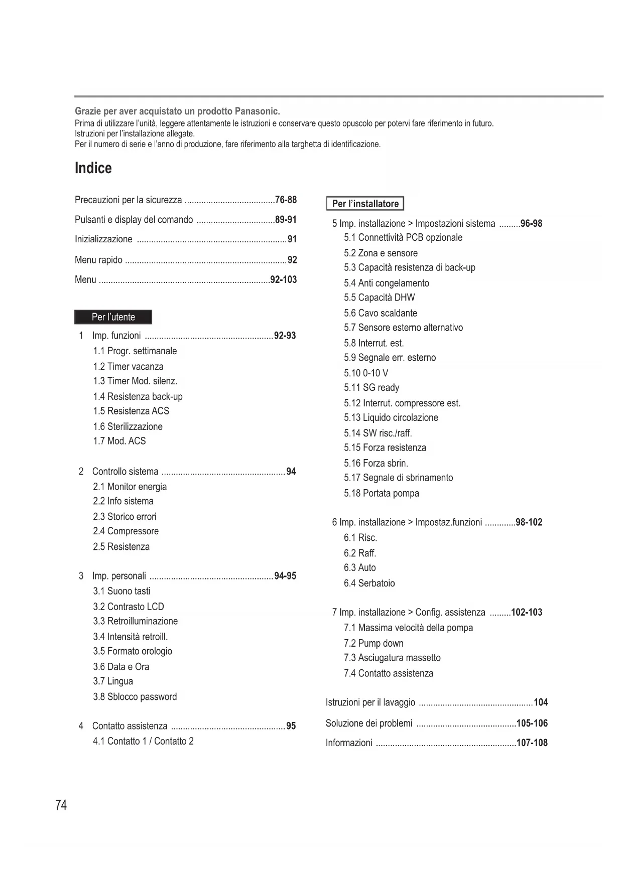 - -108 Indice Precauzioni per la sicurezza p. 76