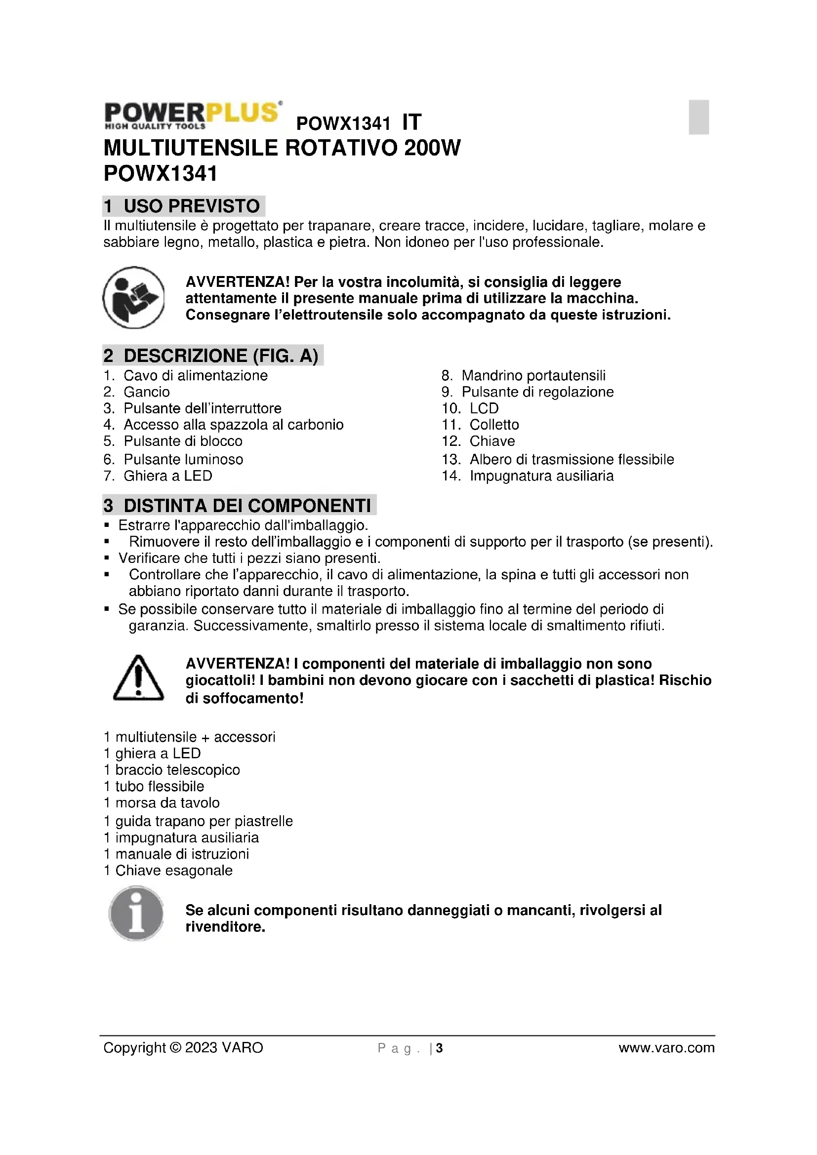 - Se possibile conservare tutto il materiale di imballaggio fino al termine del periodo di garanzia. Successivamente, smaltirlo presso il sistema locale di smaltimento rifiuti. AVVERTENZA! I componenti del materiale di imballaggio non sono giocattoli! I bambini non devono giocare con i sacchetti di plastica! Rischio di soffocamento! 1 multiutensile + accessori 1 ghiera a LED 1 braccio telescopico 1 tubo flessibile 1 morsa da tavolo 1 guida trapano per piastrelle 1 impugnatura ausiliaria 1 manuale di istruzioni 1 Chiave esagonale Se alcuni componenti risultano danneggiati o mancanti, rivolgersi al rivenditore.POWX1341 IT Copyright © 2023 VARO P a g . | 4 www.varo.com 4 SIMBOLI Nel presente manuale e/o sull’apparecchio sono utilizzati i seguenti simboli: