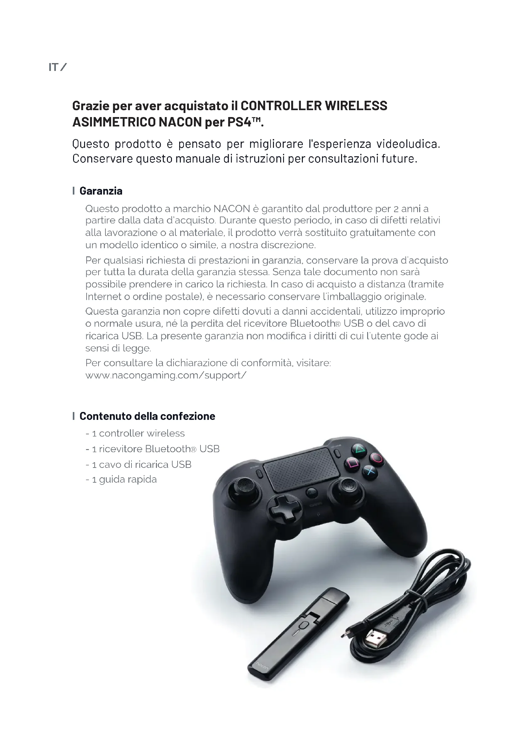 ASIMMETRICO “2”, “PlayStation”, “DUALSHOCK” , “Ø” and “KHJL” are registered trademarks of Sony Interactive Entertainment Inc. All rights reserved. NACON è un marchio registrato. ƍǀƒžŬƲƂƵƝȾǀƼƂƣƼƂ TA-2019/276APPROVED TRA REGISTERED No:ER72115/19DEALER No:DA82617/19IT / Grazie per aver acquistato il CONTROLLER WIRELESS ASIMMETRICO NACON per PS4™. Questo prodotto è pensato per migliorare l'esperienza videoludica. Conservare questo manuale di istruzioni per consultazioni future. I Garanzia Questo prodotto a marchio NACON è garantito dal produttore per 2 anni a partire dalla data d’acquisto. Durante questo periodo, in caso di difetti relativi alla lavorazione o al materiale, il prodotto verrà sostituito gratuitamente con un modello identico o simile, a nostra discrezione. Per qualsiasi richiesta di prestazioni in garanzia, conservare la prova d'acquisto per tutta la durata della garanzia stessa. Senza tale documento non sarà possibile prendere in carico la richiesta. In caso di acquisto a distanza (tramite Internet o ordine postale), è necessario conservare l'imballaggio originale. Questa garanzia non copre difetti dovuti a danni accidentali, utilizzo improprio o normale usura, né la perdita del ricevitore Bluetooth ® USB o del cavo di ųĜϱųĜϱţX±ŞųåŸåĹƋåč±ų±ĹDŽĜ±ĹŅĹĵŅÚĜĀϱĜÚĜųĜƋƋĜÚĜÏƚĜĬŲƚƋåĹƋåčŅÚå±Ĝ sensi di legge. Per consultare la dichiarazione di conformità, visitare: www.nacongaming.com/support/ I Contenuto della confezione - 1 controller wireless - 1 ricevitore Bluetooth ® USB - 1 cavo di ricarica USB - 1 guida rapidaIT / I Descrizione dei componenti