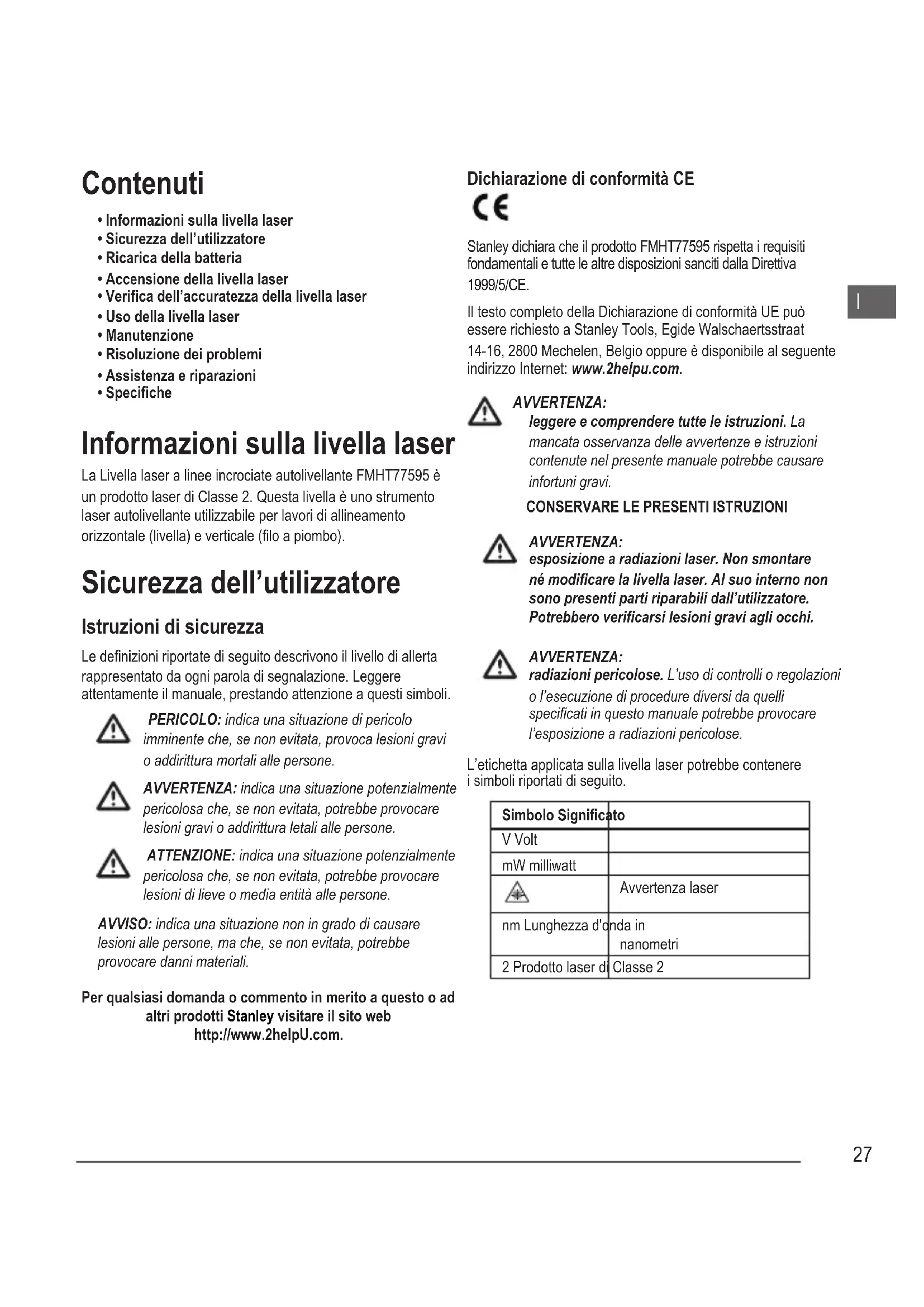 - Speciche Informazioni sulla livella laser La Livella laser a linee incrociate autolivellante FMHT77595 è un prodotto laser di Classe 2. Questa livella è uno strumento laser autolivellante utilizzabile per lavori di allineamento orizzontale (livella) e verticale (lo a piombo). Sicurezza dell’utilizzatore Istruzioni di sicurezza Le denizioni riportate di seguito descrivono il livello di allerta rappresentato da ogni parola di segnalazione. Leggere attentamente il manuale, prestando attenzione a questi simboli. PERICOLO: indica una situazione di pericolo imminente che, se non evitata, provoca lesioni gravi o addirittura mortali alle persone. AVVERTENZA: indica una situazione potenzialmente pericolosa che, se non evitata, potrebbe provocare lesioni gravi o addirittura letali alle persone. ATTENZIONE: indica una situazione potenzialmente pericolosa che, se non evitata, potrebbe provocare lesioni di lieve o media entità alle persone. AVVISO: indica una situazione non in grado di causare lesioni alle persone, ma che, se non evitata, potrebbe provocare danni materiali. Per qualsiasi domanda o commento in merito a questo o ad altri prodotti Stanley visitare il sito web http://www.2helpU.com. Dichiarazione di conformità CE Stanley dichiara che il prodotto FMHT77595 rispetta i requisiti fondamentali e tutte le altre disposizioni sanciti dalla Direttiva 1999/5/CE. Il testo completo della Dichiarazione di conformità UE può essere richiesto a Stanley Tools, Egide Walschaertsstraat 14-16, 2800 Mechelen, Belgio oppure è disponibile al seguente indirizzo Internet: www.2helpu.com. AVVERTENZA: leggere e comprendere tutte le istruzioni. La mancata osservanza delle avvertenze e istruzioni contenute nel presente manuale potrebbe causare infortuni gravi.