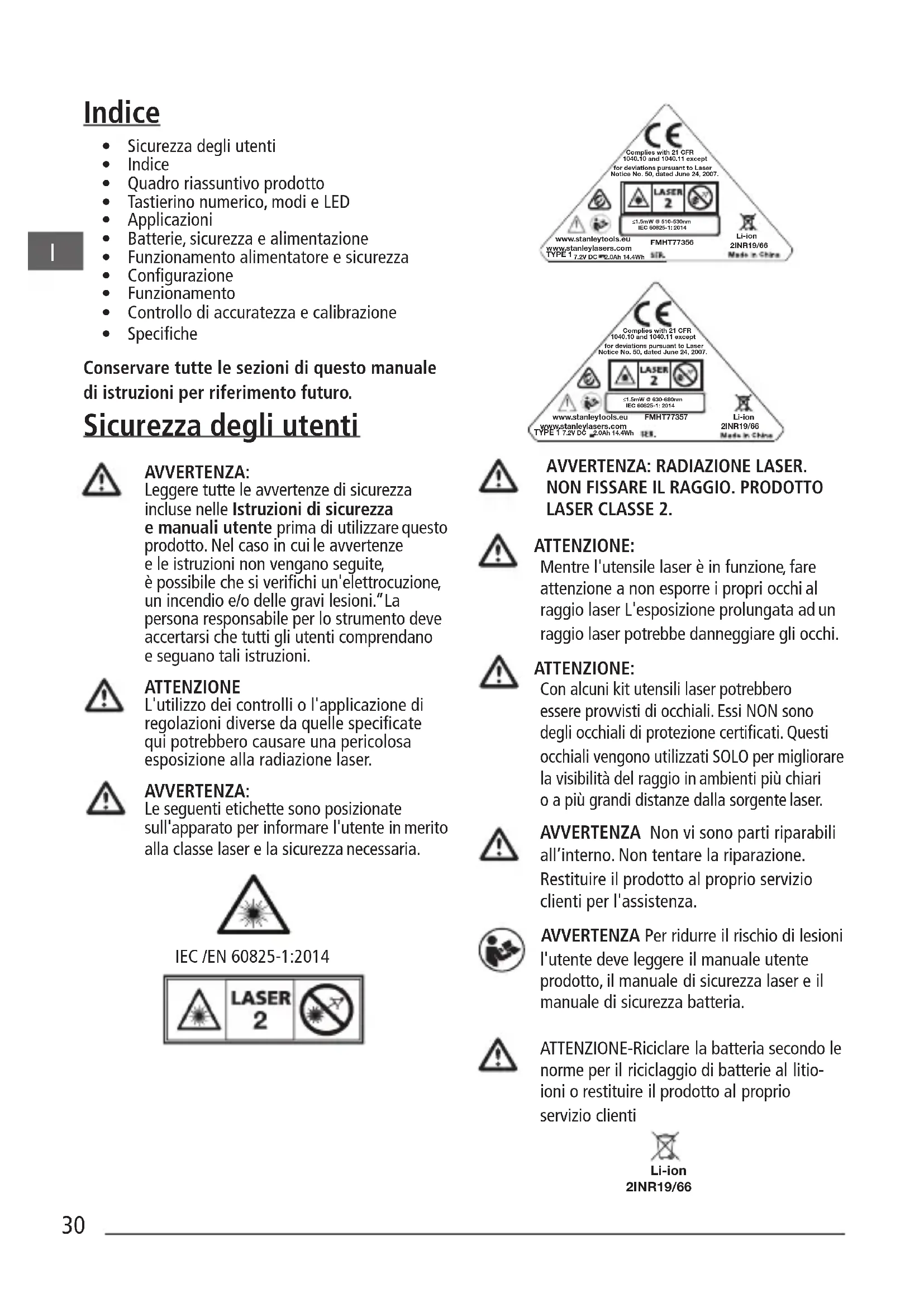 LASER CLASSE 2. ATTENZIONE: Mentre l'utensile laser èin funzione, fare attenzione anon esporre ipropri occhi al raggio laser L'esposizione prolungata ad un raggio laser potrebbe danneggiare gli occhi. ATTENZIONE: Con alcuni kit utensili laser potrebbero essere provvisti di occhiali. Essi NON sono degli occhiali di protezione certicati. Questi occhiali vengono utilizzati SOLO per migliorare la visibilità del raggio in ambienti più chiari oapiù grandi distanze dalla sorgente laser. AVVERTENZA Non vi sono parti riparabili all’interno. Non tentare la riparazione. Restituire il prodotto al proprio servizio clienti per l'assistenza. AVVERTENZA Per ridurre il rischio di lesioni l'utente deve leggere il manuale utente prodotto, il manuale di sicurezza laser eil manuale di sicurezza batteria. ATTENZIONE-Riciclare la batteria secondo le norme per il riciclaggio di batterie al litio- ioni orestituire il prodotto al proprio servizio clienti 2INR19/66 Li-ion