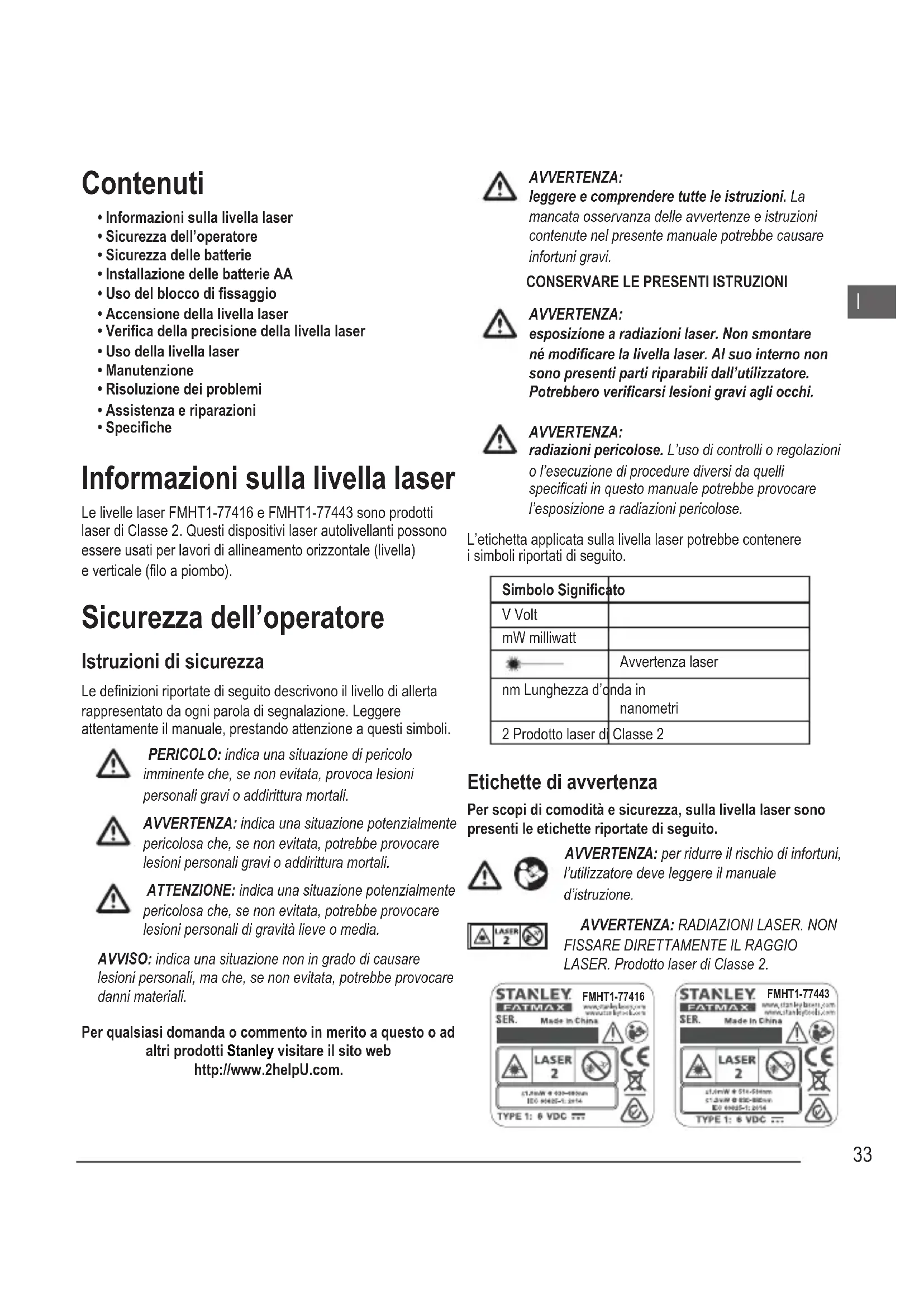 - Speciche Informazioni sulla livella laser Le livelle laser FMHT1-77416 e FMHT1-77443 sono prodotti laser di Classe 2. Questi dispositivi laser autolivellanti possono essere usati per lavori di allineamento orizzontale (livella) e verticale (lo a piombo). Sicurezza dell’operatore Istruzioni di sicurezza Le denizioni riportate di seguito descrivono il livello di allerta rappresentato da ogni parola di segnalazione. Leggere attentamente il manuale, prestando attenzione a questi simboli. PERICOLO: indica una situazione di pericolo imminente che, se non evitata, provoca lesioni personali gravi o addirittura mortali. AVVERTENZA: indica una situazione potenzialmente pericolosa che, se non evitata, potrebbe provocare lesioni personali gravi o addirittura mortali. ATTENZIONE: indica una situazione potenzialmente pericolosa che, se non evitata, potrebbe provocare lesioni personali di gravità lieve o media. AVVISO: indica una situazione non in grado di causare lesioni personali, ma che, se non evitata, potrebbe provocare danni materiali. Per qualsiasi domanda o commento in merito a questo o ad altri prodotti Stanley visitare il sito web http://www.2helpU.com. AVVERTENZA: leggere e comprendere tutte le istruzioni. La mancata osservanza delle avvertenze e istruzioni contenute nel presente manuale potrebbe causare infortuni gravi.