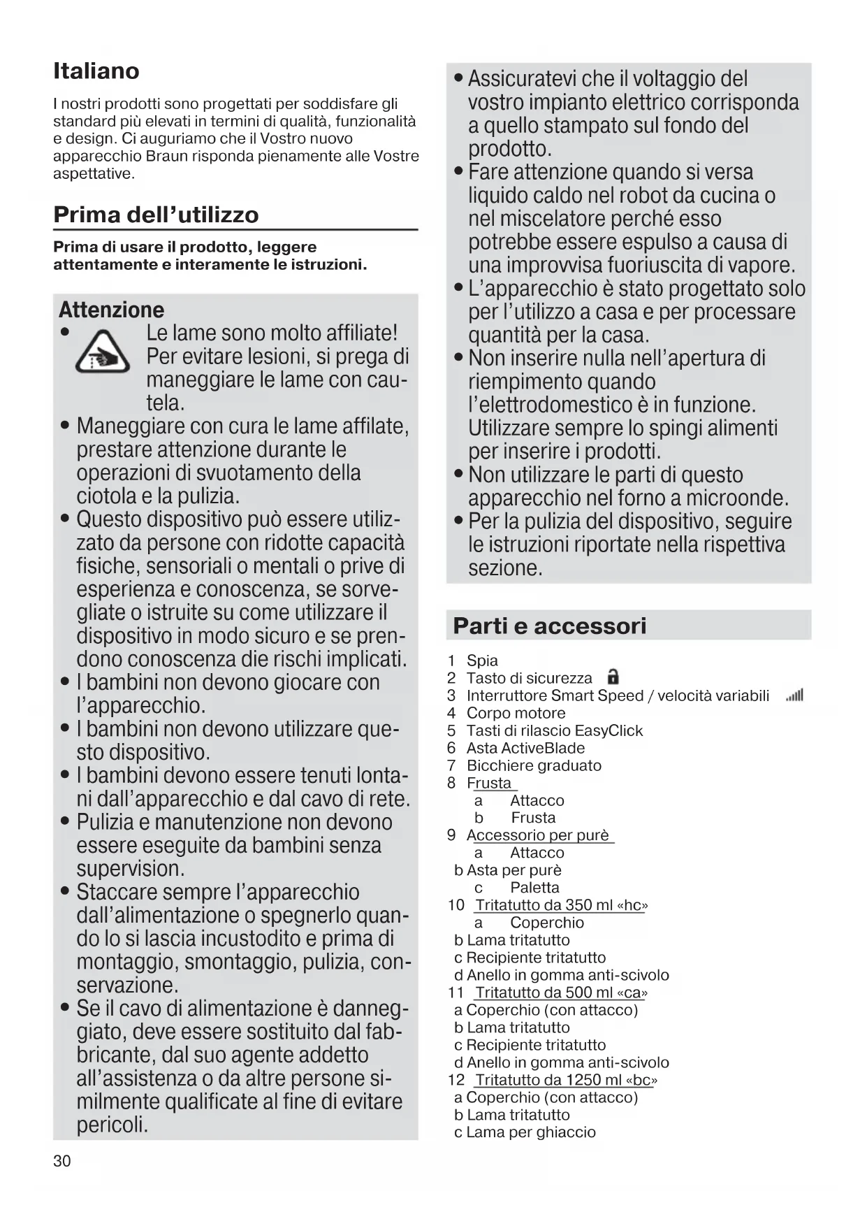 Per la pulizia del dispositivo, seguire le istruzioni riportate nella rispettiva sezione. Parti e accessori 1 Spia 2 Tasto di sicurezza 3 Interruttore Smart Speed / velocità variabili 4 Corpo motore 5 Tasti di rilascio EasyClick 6 Asta ActiveBlade 7 Bicchiere graduato 8 Frusta a Attacco b Frusta 9 Accessorio per purè a Attacco b Asta per purè c Paletta 10 Tritatutto da 350 ml «hc» a Coperchio b Lama tritatutto c Recipiente tritatutto d Anello in gomma anti-scivolo 11 Tritatutto da 500 ml «ca» a Coperchio (con attacco) b Lama tritatutto c Recipiente tritatutto d Anello in gomma anti-scivolo 12 Tritatutto da 1250 ml «bc» a Coperchio (con attacco) b Lama tritatutto c Lama per ghiaccio 5722112414_MQ9045X_INT_S6-116.indd 30 17.10.16 11:2131 d Recipiente tritatutto e Anello in gomma anti-scivolo Pulire tutte le parti prima di utilizzare il dispositivo per la prima volta – fare riferimento a «Cura e pulizia». Spia La spia (1) mostra lo stato dell’apparecchio quando è collegato a una presa elettrica. Spia Apparecchio/Stato operativo Rosso intermittente L’apparecchio è pronto all’uso. Verde L’apparecchio è sbloccato (tasto di rilascio dell’interruttore premu- to) e può essere acceso Rosso Pre-allarme di surriscaldamento. Il motore rallenta piano piano Ä no allo spegnimento. Lasciare raf- freddare il dispositivo. Sarà nuo- vamente pronto all’uso quando la spia diventa rossa a intermittenza. Se la velocità massima diminuisce a causa di carico elevato e tempi di esercizio prolungati è comunque possibile concludere la preparazione, ma in seguito l’apparecchio deve essere lasciato raffreddare. Come utilizzare l’apparecchio Interruttore Smart Speed per velocità variabili Una pressione, tutte le velocità. Più si preme, più aumenta la velocità. Maggiore è la velocità, più rapidi e fini sono i risultati della miscelazione e della triturazione. Funzionamento con una mano: l’interruttore Smart Speed (3) consente di accendere l’apparecchio e di controllare la velocità con una mano sola. Frullatore a immersione Primo utilizzo: Rimuovere la protezione per il trasporto dal corpo motore (4) tirandola dalla fascetta rossa. Accensione (A) L’apparecchio dispone di un tasto di sicurezza per il rilascio dell’interruttore Smart Speed. Per accenderlo in sicurezza, seguire questa procedura: