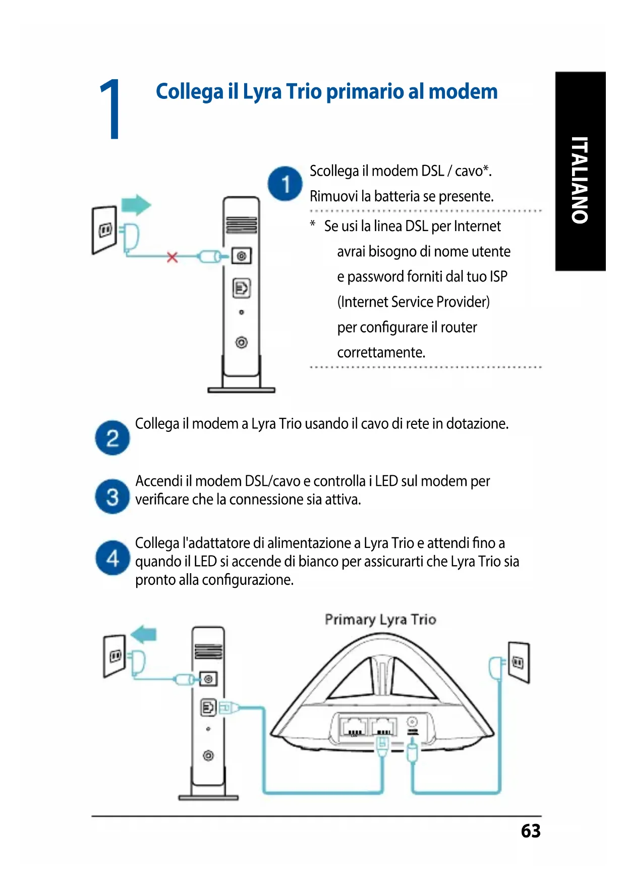 Collega l'adattatore di alimentazione a Lyra Trio e attendi no a quando il LED si accende di bianco per assicurarti che Lyra Trio sia pronto alla congurazione. LAN64 ITALIANO Congurazione del sistema Wi-Fi Lyra Trio Avvia l'app ASUS Lyra sul tuo dispositivo mobile e segui le istruzioni sullo schermo.