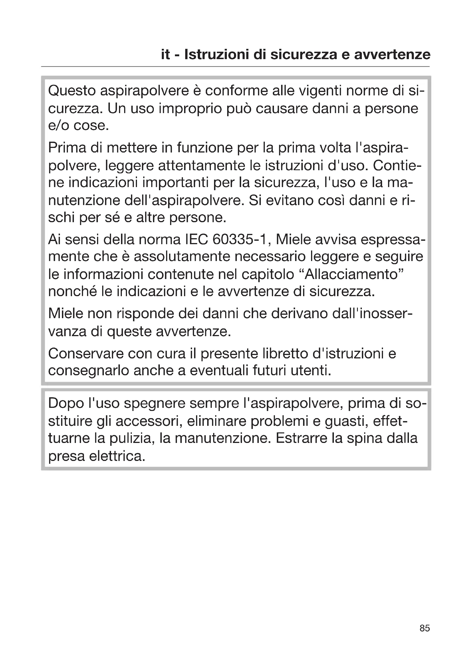 Questo aspirapolvere è conforme alle vigenti norme di si- curezza. Un uso improprio può causare danni a persone e/o cose. Prima di mettere in funzione per la prima volta l'aspira- polvere, leggere attentamente le istruzioni d'uso. Contie- ne indicazioni importanti per la sicurezza, l'uso e la ma- nutenzione dell'aspirapolvere. Si evitano così danni e ri- schi per sé e altre persone. Ai sensi della norma IEC 60335-1, Miele avvisa espressa- mente che è assolutamente necessario leggere e seguire le informazioni contenute nel capitolo “Allacciamento” nonché le indicazioni e le avvertenze di sicurezza. Miele non risponde dei danni che derivano dall'inosser- vanza di queste avvertenze. Conservare con cura il presente libretto d'istruzioni e consegnarlo anche a eventuali futuri utenti. Dopo l'uso spegnere sempre l'aspirapolvere, prima di so- stituire gli accessori, eliminare problemi e guasti, effet- tuarne la pulizia, la manutenzione. Estrarre la spina dalla presa elettrica.it - Istruzioni di sicurezza e avvertenze
