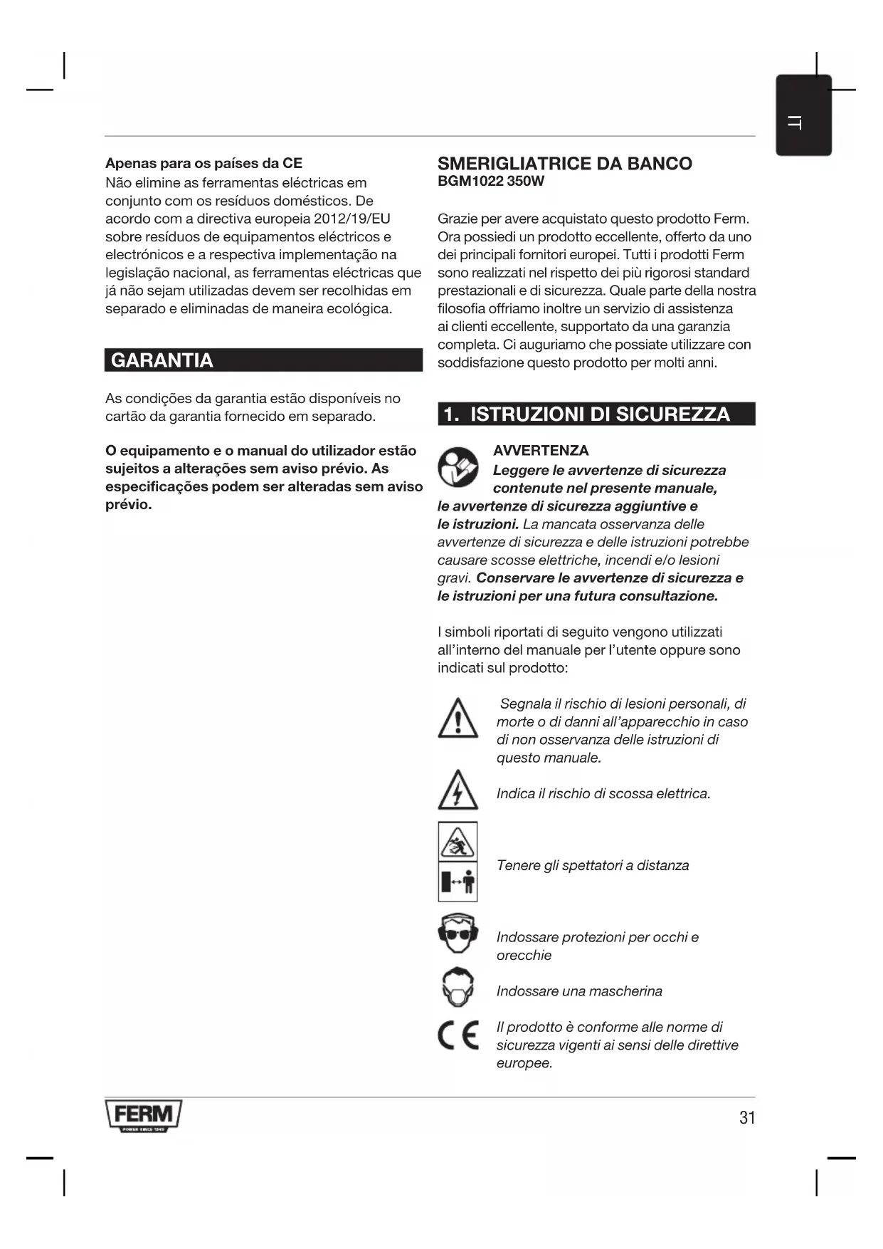 BGM1022 350W Grazie per avere acquistato questo prodotto Ferm. Ora possiedi un prodotto eccellente, offerto da uno dei principali fornitori europei. Tutti i prodotti Ferm sono realizzati nel rispetto dei più rigorosi standard prestazionali e di sicurezza. Quale parte della nostra filosofia offriamo inoltre un servizio di assistenza ai clienti eccellente, supportato da una garanzia completa. Ci auguriamo che possiate utilizzare con soddisfazione questo prodotto per molti anni.
