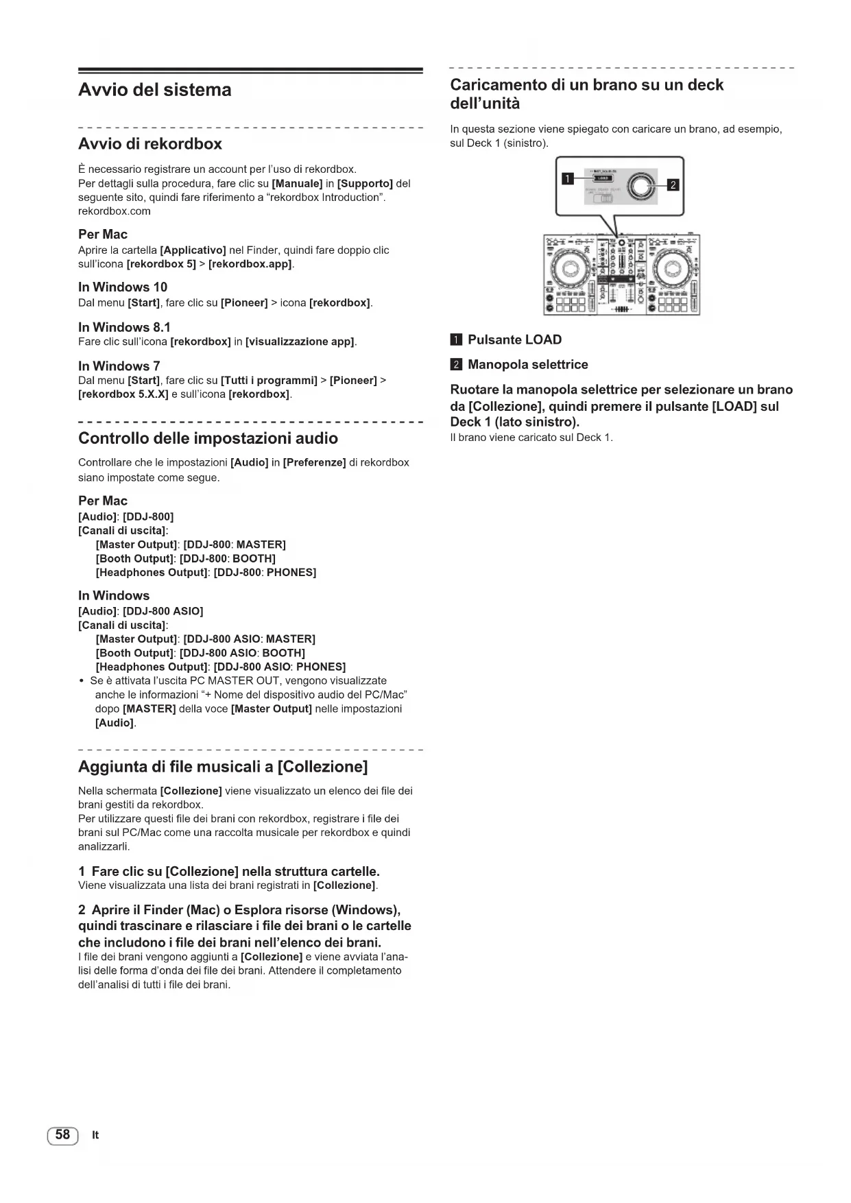 Avvio del sistema Avvio di rekordbox È necessario registrare un account per l’uso di rekordbox. Per dettagli sulla procedura, fare clic su [Manuale] in [Supporto] del seguente sito, quindi fare riferimento a “rekordbox Introduction”. rekordbox.com Per Mac Aprire la cartella [Applicativo] nel Finder, quindi fare doppio clic sull’icona [rekordbox 5] > [rekordbox.app]. In Windows 10 Dal menu [Start], fare clic su [Pioneer] > icona [rekordbox]. In Windows 8.1 Fare clic sull’icona [rekordbox] in [visualizzazione app]. In Windows 7 Dal menu [Start], fare clic su [Tutti i programmi] > [Pioneer] > [rekordbox 5.X.X] e sull’icona [rekordbox]. Controllo delle impostazioni audio Controllare che le impostazioni [Audio] in [Preferenze] di rekordbox siano impostate come segue. Per Mac [Audio]: [DDJ-800] [Canali di uscita]: [Master Output]: [DDJ-800: MASTER] [Booth Output]: [DDJ-800: BOOTH] [Headphones Output]: [DDJ-800: PHONES] In Windows [Audio]: [DDJ-800 ASIO] [Canali di uscita]: [Master Output]: [DDJ-800 ASIO: MASTER] [Booth Output]: [DDJ-800 ASIO: BOOTH] [Headphones Output]: [DDJ-800 ASIO: PHONES] ! Se è attivata l’uscita PC MASTER OUT, vengono visualizzate anche le informazioni “+ Nome del dispositivo audio del PC/Mac” dopo [MASTER] della voce [Master Output] nelle impostazioni [Audio]. Aggiunta di file musicali a [Collezione] Nella schermata [Collezione] viene visualizzato un elenco dei file dei brani gestiti da rekordbox. Per utilizzare questi file dei brani con rekordbox, registrare i file dei brani sul PC/Mac come una raccolta musicale per rekordbox e quindi analizzarli. 1 Fare clic su [Collezione] nella struttura cartelle. Viene visualizzata una lista dei brani registrati in [Collezione]. 2 Aprire il Finder (Mac) o Esplora risorse (Windows), quindi trascinare e rilasciare i file dei brani o le cartelle che includono i file dei brani nell’elenco dei brani. I file dei brani vengono aggiunti a [Collezione] e viene avviata l’ana- lisi delle forma d’onda dei file dei brani. Attendere il completamento dell’analisi di tutti i file dei brani. Caricamento di un brano su un deck dell’unità In questa sezione viene spiegato con caricare un brano, ad esempio, sul Deck 1 (sinistro).