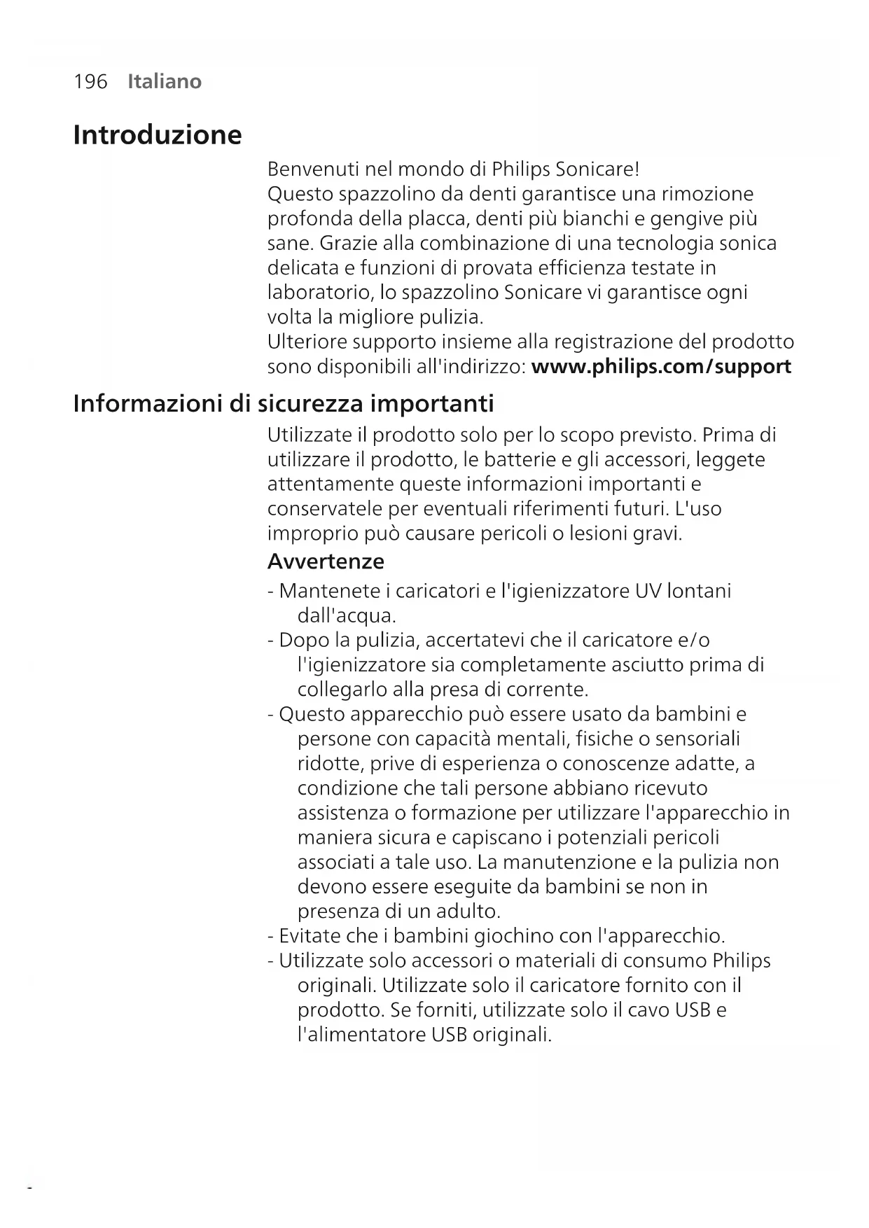 Italiano Introduzione Benvenuti nel mondo di Philips Sonicare! Questo spazzolino da denti garantisce una rimozione profonda della placca, denti più bianchi e gengive più sane. Grazie alla combinazione di una tecnologia sonica delicata e funzioni di provata efficienza testate in laboratorio, lo spazzolino Sonicare vi garantisce ogni volta la migliore pulizia. Ulteriore supporto insieme alla registrazione del prodotto sono disponibili all'indirizzo: www.philips.com/support Informazioni di sicurezza importanti Utilizzate il prodotto solo per lo scopo previsto. Prima di utilizzare il prodotto, le batterie e gli accessori, leggete attentamente queste informazioni importanti e conservatele per eventuali riferimenti futuri. L'uso improprio può causare pericoli o lesioni gravi. Avvertenze - Mantenete i caricatori e l'igienizzatore UV lontani dall'acqua. - Dopo la pulizia, accertatevi che il caricatore e/o l'igienizzatore sia completamente asciutto prima di collegarlo alla presa di corrente. - Questo apparecchio può essere usato da bambini e persone con capacità mentali, fisiche o sensoriali ridotte, prive di esperienza o conoscenze adatte, a condizione che tali persone abbiano ricevuto assistenza o formazione per utilizzare l'apparecchio in maniera sicura e capiscano i potenziali pericoli associati a tale uso. La manutenzione e la pulizia non devono essere eseguite da bambini se non in presenza di un adulto. - Evitate che i bambini giochino con l'apparecchio. - Utilizzate solo accessori o materiali di consumo Philips originali. Utilizzate solo il caricatore fornito con il prodotto. Se forniti, utilizzate solo il cavo USB e l'alimentatore USB originali.197 Italiano - Questo apparecchio non contiene parti riparabili dall'utente. Se l'apparecchio è danneggiato, smettete di utilizzarlo e contattate il Centro Assistenza Clienti del vostro Paese. Solo apparecchi con cavo: se il cavo è danneggiato, sostituite il caricatore con l'igienizzatore con uno nuovo. - Non utilizzate il caricabatterie e/o l'igienizzatore in esterni o in prossimità di superfici calde. - Non lavate i componenti del prodotto in lavastoviglie. - Questo apparecchio è destinato esclusivamente alla pulizia di denti, gengive e lingua. - Tenete sempre l'igienizzatore fuori dalla portata dei bambini. - Interrompete l'uso dell'igienizzatore se la lampadina a raggi UV rimane accesa nonostante lo sportello sia aperto. i raggi UV potrebbero essere nocivi per gli occhi e la pelle. - Utilizzate l'igienizzatore solo con lo schermo protettivo installato. - Non toccate la lampadina a raggi UV dell'igienizzatore UV se incandescente. - Non utilizzate l'apparecchio in presenza di setole rovinate o piegate. Sostituite la testina dello spazzolino ogni3 mesi o prima in presenza di segni di usura. - Evitate il contatto diretto con prodotti contenenti oli essenziali o olio di cocco. Potrebbe verificarsi il distacco delle setole. - Interrompete l'utilizzo dell'apparecchio e consultate il vostro dentista/medico in caso di eccessivo sanguinamento dopo l'uso, se il sanguinamento continua anche dopo 1 settimana di utilizzo o se avvertite fastidio o dolore. - Se nel corso degli ultimi 2 mesi vi siete sottoposti a interventi su denti o gengive, chiedete il parere del vostro dentista prima di utilizzare l'apparecchio. - I portatori di pacemaker o di altro dispositivo impiantato devono consultare il medico o il produttore del dispositivo impiantato prima dell'uso. - In caso di problemi orali, consultate il medico prima di utilizzare questo apparecchio.198 Italiano - Questo apparecchio è assolutamente personale e non deve essere utilizzato da più persone o presso studi dentistici. Istruzioni di sicurezza per le batterie - Questo apparecchio contiene batterie che possono essere rimosse solo da persone esperte. - Utilizzate il prodotto solo per lo scopo previsto. Prima di utilizzare il prodotto, le batterie e gli accessori, leggete attentamente queste informazioni e conservatele per eventuali riferimenti futuri. L'uso improprio può causare pericoli o lesioni gravi. Gli accessori forniti potrebbero variare a seconda del prodotto. - Utilizzate solo accessori e materiali di consumo Philips originali. Utilizzate solo l'alimentatore rimovibile TCBxxxx, HX6100, HX6110, HX6160 o WAAxxxx. - Tenete il prodotto e le batterie lontani dal fuoco e non esponeteli alla luce solare diretta o alle alte temperature. - Se il prodotto si surriscalda in modo anomalo, emana un odore strano, cambia colore o se la ricarica richiede più tempo del solito, interrompete l'utilizzo e la ricarica del prodotto e contattate Philips. - Non collocate i prodotti e le relative batterie in forni a microonde o su fornelli a induzione. - Per evitare che le batterie si surriscaldino o rilascino sostanze tossiche o pericolose, non aprite, modificate, perforate, danneggiate o smontate il prodotto o le batterie. Non mandate in cortocircuito, sovraccaricate o invertite la polarità delle batterie. - Questo apparecchio contiene batterie non sostituibili. Smaltite in modo adeguato l'apparecchio quando la batteria è esaurita. Consultate la sezione sul riciclo. - Se le batterie sono danneggiate o perdono del liquido, evitate il contatto con la pelle o gli occhi. In tal caso, sciacquate subito e accuratamente con acqua e consultate un medico. - Quando maneggiate le batterie, assicuratevi che le mani, il prodotto e le batterie siano asciutti.199 Italiano - Per evitare il cortocircuito accidentale delle batterie dopo la rimozione, evitate che i terminali delle batterie entrino in contatto con oggetti metallici, come monete, forcine o anelli. Non avvolgete le batterie in una pellicola di alluminio. Coprite i terminali delle batterie o riponete le batterie in un sacchetto di plastica prima di smaltirle. - Ricaricate, utilizzate e immagazzinate il prodotto a una temperatura compresa tra 0 °C e 40 °C. Condizioni di stoccaggio e trasporto Temperatura da -10°C a 60°C. Campi elettromagnetici (EMF) Questo a