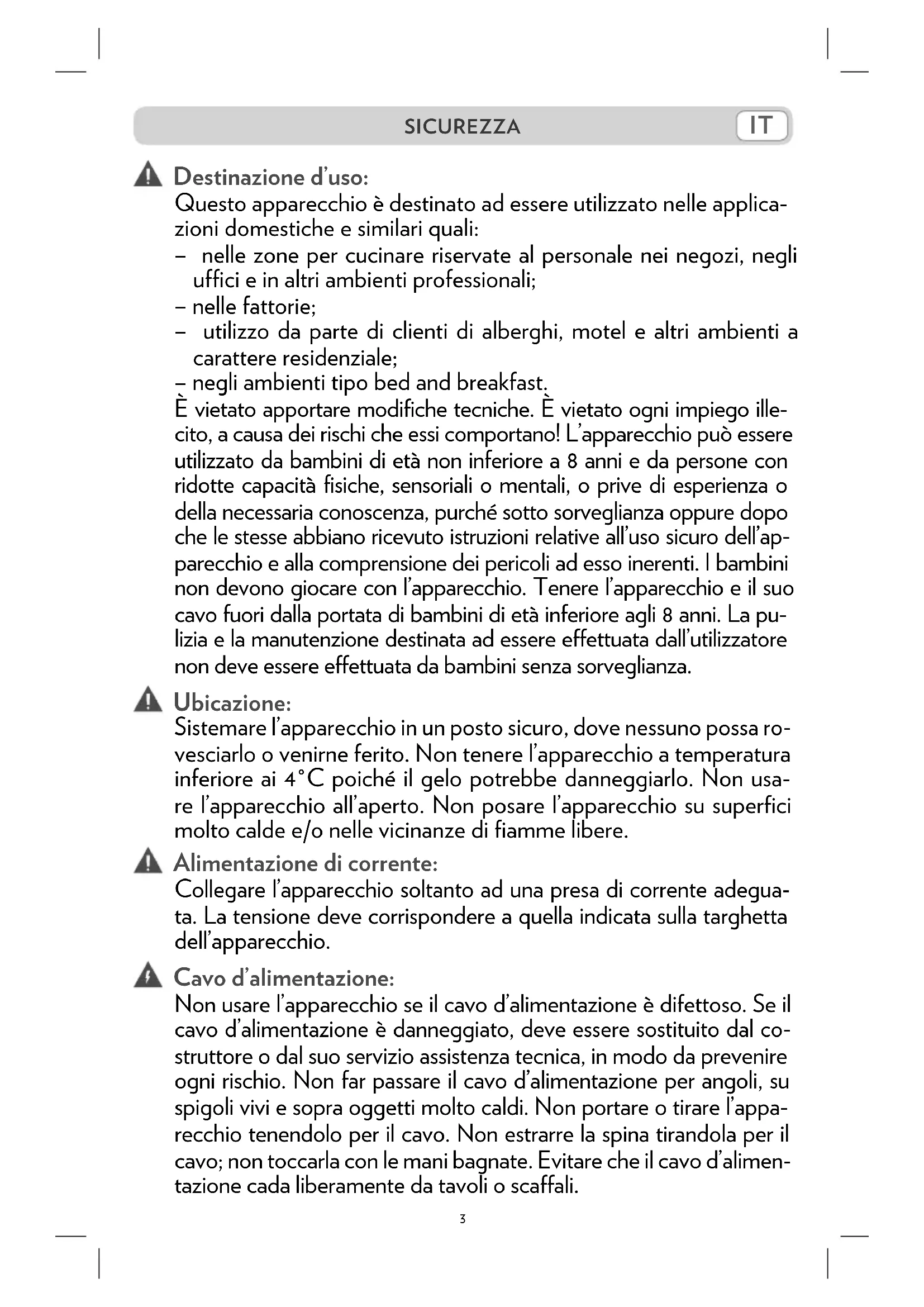 E vietato apportare modifiche tecniche. E vietatogni impiego illecito, a causa dei rischi cheeci comportano! L'apparecchio più essereutilizzato da bambini di età non inferiore a 8 anni e da persone con ridotte capacità fisiche, sensoriali o mentali, o prive di esperienza o della necessaria conoscenza, parché sotto sorvegianza oppure dopo che le stesse abbiano ricevuto istruzioni relative all'uso sicuro dell'apparecchio e alla comprenione dei pericoli adesso inerenti. I bambini non devono giocare con l'apparecchio. Tenere l'apparecchio e il suo cavo fuori alla portata di bambini di età inferioreagli 8 anni. La pulizia e la manutenzione destinata ad essere effettuata dall'utilizzatore non delve essere effettuata da bambini sulla sorvegianza.