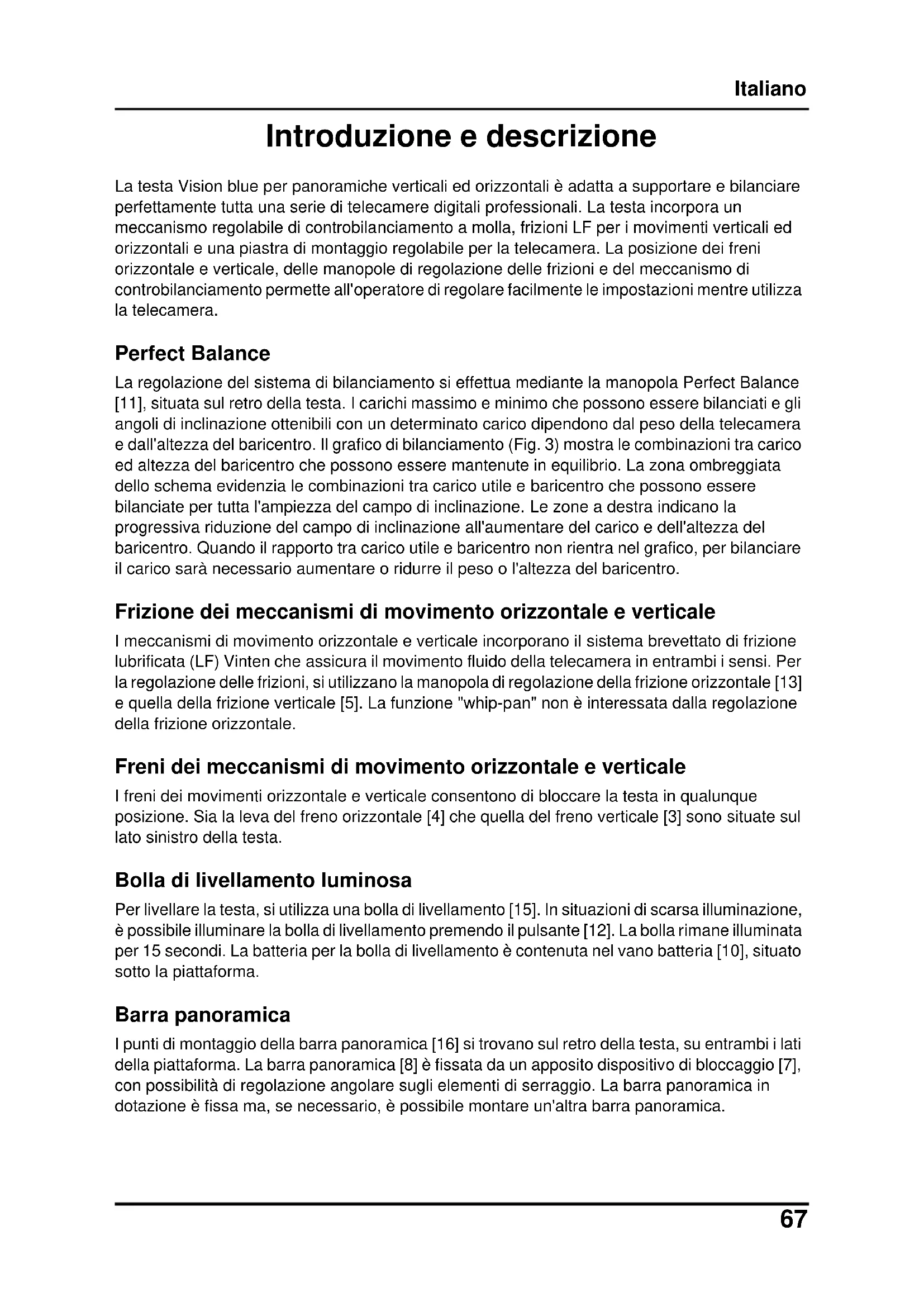 Introduzione e descrizione La testa Vision blue per panoramiche verticali ed orizzontali è adatta a supportare e bilanciare perfettamente tutta una serie di telecamere digitali professionali. La testa incorpora un meccanismo regolabile di controbilanciamento a molla, frizioni LF per i movimenti verticali ed orizzontali e una piastra di montaggio regolabile per la telecamera. La posizione dei freni orizzontale e verticale, delle manopole di regolazione delle frizioni e del meccanismo di controbilanciamento permette all'operatore di regolare facilmente le impostazioni mentre utilizza la telecamera. Perfect Balance La regolazione del sistema di bilanciamento si effettua mediante la manopola Perfect Balance [11], situata sul retro della testa. I carichi massimo e minimo che possono essere bilanciati e gli angoli di inclinazione ottenibili con un determinato carico dipendono dal peso della telecamera e dall'altezza del baricentro. Il grafico di bilanciamento (Fig. 3) mostra le combinazioni tra carico ed altezza del baricentro che possono essere mantenute in equilibrio. La zona ombreggiata dello schema evidenzia le combinazioni tra carico utile e baricentro che possono essere bilanciate per tutta l'ampiezza del campo di inclinazione. Le zone a destra indicano la progressiva riduzione del campo di inclinazione all'aumentare del carico e dell'altezza del baricentro. Quando il rapporto tra carico utile e baricentro non rientra nel grafico, per bilanciare il carico sarà necessario aumentare o ridurre il peso o l'altezza del baricentro. Frizione dei meccanismi di movimento orizzontale e verticale I meccanismi di movimento orizzontale e verticale incorporano il sistema brevettato di frizione lubrificata (LF) Vinten che assicura il movimento fluido della telecamera in entrambi i sensi. Per la regolazione delle frizioni, si utilizzano la manopola di regolazione della frizione orizzontale [13] e quella della frizione verticale [5]. La funzione "whip-pan" non è interessata dalla regolazione della frizione orizzontale. Freni dei meccanismi di movimento orizzontale e verticale I freni dei movimenti orizzontale e verticale consentono di bloccare la testa in qualunque posizione. Sia la leva del freno orizzontale [4] che quella del freno verticale [3] sono situate sul lato sinistro della testa. Bolla di livellamento luminosa Per livellare la testa, si utilizza una bolla di livellamento [15]. In situazioni di scarsa illuminazione, è possibile illuminare la bolla di livellamento premendo il pulsante [12]. La bolla rimane illuminata per 15 secondi. La batteria per la bolla di livellamento è contenuta nel vano batteria [10], situato sotto la piattaforma. Barra panoramica I punti di montaggio della barra panoramica [16] si trovano sul retro della testa, su entrambi i lati della piattaforma. La barra panoramica [8] è fissata da un apposito dispositivo di bloccaggio [7], con possibilità di regolazione angolare sugli elementi di serraggio. La barra panoramica in dotazione è fissa ma, se necessario, è possibile montare un'altra barra panoramica.Italiano