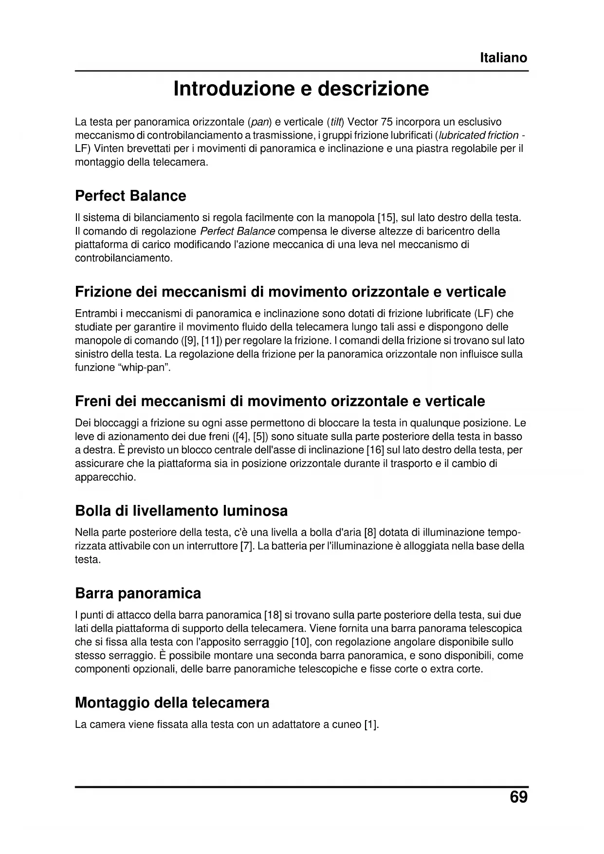 Introduzione e descrizione La testa per panoramica orizzontale (pan) e verticale (tilt) Vector 75 incorpora un esclusivo meccanismo di controbilanciamento a trasmissione, i gruppi frizione lubrificati (lubricated friction - LF) Vinten brevettati per i movimenti di panoramica e inclinazione e una piastra regolabile per il montaggio della telecamera. Perfect Balance Il sistema di bilanciamento si regola facilmente con la manopola [15], sul lato destro della testa. Il comando di regolazione Perfect Balance compensa le diverse altezze di baricentro della piattaforma di carico modificando l'azione meccanica di una leva nel meccanismo di controbilanciamento. Frizione dei meccanismi di movimento orizzontale e verticale Entrambi i meccanismi di panoramica e inclinazione sono dotati di frizione lubrificate (LF) che studiate per garantire il movimento fluido della telecamera lungo tali assi e dispongono delle manopole di comando ([9], [11]) per regolare la frizione. I comandi della frizione si trovano sul lato sinistro della testa. La regolazione della frizione per la panoramica orizzontale non influisce sulla funzione “whip-pan”. Freni dei meccanismi di movimento orizzontale e verticale Dei bloccaggi a frizione su ogni asse permettono di bloccare la testa in qualunque posizione. Le leve di azionamento dei due freni ([4], [5]) sono situate sulla parte posteriore della testa in basso a destra. È previsto un blocco centrale dell'asse di inclinazione [16] sul lato destro della testa, per assicurare che la piattaforma sia in posizione orizzontale durante il trasporto e il cambio di apparecchio. Bolla di livellamento luminosa Nella parte posteriore della testa, c'è una livella a bolla d'aria [8] dotata di illuminazione tempo- rizzata attivabile con un interruttore [7]. La batteria per l'illuminazione è alloggiata nella base della testa. Barra panoramica I punti di attacco della barra panoramica [18] si trovano sulla parte posteriore della testa, sui due lati della piattaforma di supporto della telecamera. Viene fornita una barra panorama telescopica che si fissa alla testa con l'apposito serraggio [10], con regolazione angolare disponibile sullo stesso serraggio. È possibile montare una seconda barra panoramica, e sono disponibili, come componenti opzionali, delle barre panoramiche telescopiche e fisse corte o extra corte. Montaggio della telecamera La camera viene fissata alla testa con un adattatore a cuneo [1].Italiano