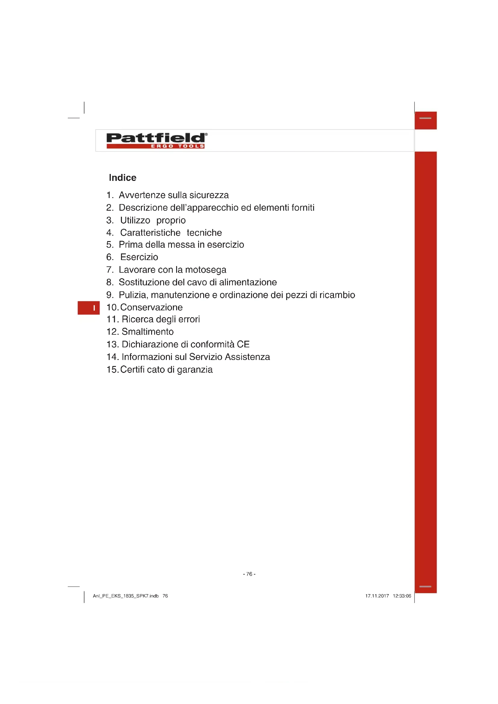 Il simbolo del bidone della spazzatura sbarrato richiede la raccolta diff erenziata dei rifi uti di apparecchiature elettriche ed elettroniche (RAEE). Tali apparecchiature possono contenere sostanze pericolo- se e nocive. Questi attrezzi devono essere restituiti presso un punto di raccolta per il riciclaggio RAEE e non devono essere smaltiti come rifi uti urbani. In questo modo, si contribuisce a preservare le risorse e proteggere l‘ambiente. Contattare le autorità locali per ottenere ulteri- ori informazioni. A causa del pericolo di lesioni o di soff ocamento i bambini non devo- no giocare con i sacchetti di plastica e materiali di imballaggio. Con- servare tale materiale in modo sicuro o smaltirlo in modo rispettoso dell‘ambiente. Con riserva di apportare modifi che tecniche Anl_PE_EKS_1835_SPK7.indb 105Anl_PE_EKS_1835_SPK7.indb 105 17.11.2017 12:33:0817.11.2017 12:33:08I