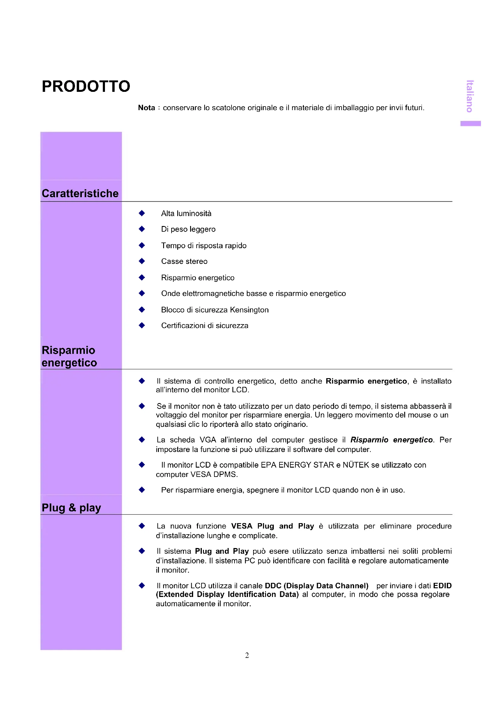La nuova funzione VESA Plug and Play è utilizzata per eliminare procedure d’installazione lunghe e complicate. Il sistema Plug and Play può esere utilizzato senza imbattersi nei soliti problemi d’installazione. Il sistema PC può identificare con facilità e regolare automaticamente il monitor. Il monitor LCD utilizza il canale DDC (Display Data Channel) per inviare i dati EDID (Extended Display Identification Data) al computer, in modo che possa regolare automaticamente il monitor.3 Italiano SICUREZZA Nota: prima di utilizzare questo monitor leggere le seguenti precauzioni di sicurezza. Parte elettrica Controllare il voltaggio Questo prodotto deve essere fatto funzionare utiizzando I tipo di aimentazioni indicato nell’etichetta. Se non si fosse sicuri del tipo di alimentazione disponibile, rivogersi al rivenditore locale o alla società fornitrice di energia. Scosse elettriche Questo prodotto è dotato di una spina tripolare, con uno degli spinotti per la messa a terra. Questa spina può essere inserita solo in prese predisposte per a messa a terra. Si tratta di una misura di sicurezza. Se non si riesca ad inserire la spina nela presa, rivolgersi ad un elettricista per far sostituire la presa perché obsoleta. Non eliminar elo spinotto per la messa a terra. Per prevenire scosse elettriche non inserire alcun oggetto metallico nelle aperture della struttura del monitor. Non tentre di riparare il prodotto da soli, l’apertura della parte interna potrebbe esporre a tensioni elevate o presentare altri rischi. Per le operazioni di manutenzione rivolgersi a presonale tecnico qualificato. Se il cavo di alimentazione è danneggiato, non utilizzare il monitor LCD. Non collocre alcun oggetto sul cavo di aimentazione; sistemare il cavo di alimentazione lontano da aree trafficate. Quando si scollega il monitor LCD dalla presa di corrente a muro, agire sulla spina e non sul cavo. Non esporre il monitor LCD a pioggia e non posizionarlo in prossimità di acqua (ad esempio cucine o piscine). Se il monitor LCD fosse umido, scollegare il cavo di alimentazione e mettersi in contatto con il Centro servizi. Condizioni anomale Se il monitor LCD funziona in modo inappropriato, specialment se emette suoni strani o odori e/o fumo insoliti scollegarlo immediatamente e mettersi in contatto con il Centro servizi.4 Italiano Comuni Cura del monitor e dello schermo Evitare di toccare lo schermo con le dita o con oggetti duri. Il grasso dela pelle è difficile da rimuovere, e toccare lo schermo con oggetti duri può danneggiare il pannello. Pulire il monitor usando un panno asciutto e morbido dopo averlo spento. Il monitor LCD non deve essere utilizzato in ambienti polverosi e umidi. Il monitor LCD deve essere tenuto distante da sorgenti di calore e radiazioni. Per esempio: fornelli, forni, o luce solare diretta. Per evitare il riflesso, posizionare il monitor in un punto chenonsia esposto alla luce solare diretta. Non permettere ai bambini di giocare con il monitor. Se lo schermo viene toccato frequentemente, si lasciano impronte e la qualità dell’immagine viene degradata. Se il monito deve essere spostato, scollegarlo e maneggiarlo con cura. Non collocare oggetti sopra il monitor. Se il monitor LCD non viene utilizzato per lunghi periodi di tempo, scollegarlo e riporlo in una confezione idonea, utilizzando di preferenza lo scatolone orginale e il materiale di imballaggio originale. Le aperture del monitor LCD servono alla ventilazione. Per evitare il surriscaldamento, queste aperture non devono essere né bloccate né coperte. Non collocare iI monitor LCD su letti, divani, coperte o altre superfici soffici; diversamente gli oggetti bloccheranno le aperture del monitor LCD. Se si colloca il monitor LCD su uno scaffale o in altri luoghi ristretti, è essenziale lasciare almeno 4 pollici (10 cm) tra il monitor e le superfici circostanti. Pulizia dello schermo Assicurarsi che l’area intorno al monitor LCD sia pulita e priva di condensa. Fare riferimento al capitolo "Manutenzione" per avere informazioni sulle normali procedure di alimentazione.5 Italiano