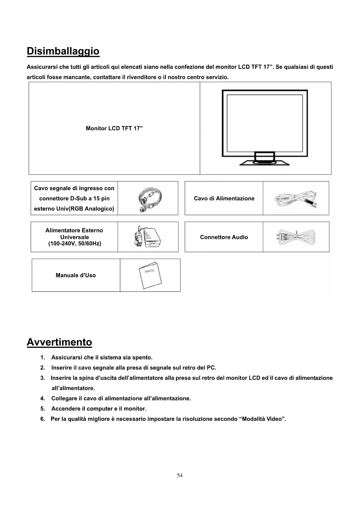 Le informazioni del presente manuale sono soggette a variazioni senza preavviso.53 Il Monitor54 Disimballaggio Assicurarsi che tutti gli articoli qui elencati siano nella confezione del monitor LCD TFT 17”. Se qualsiasi di questi articoli fosse mancante, contattare il rivenditore o il nostro centro servizio. Monitor LCD TFT 17”