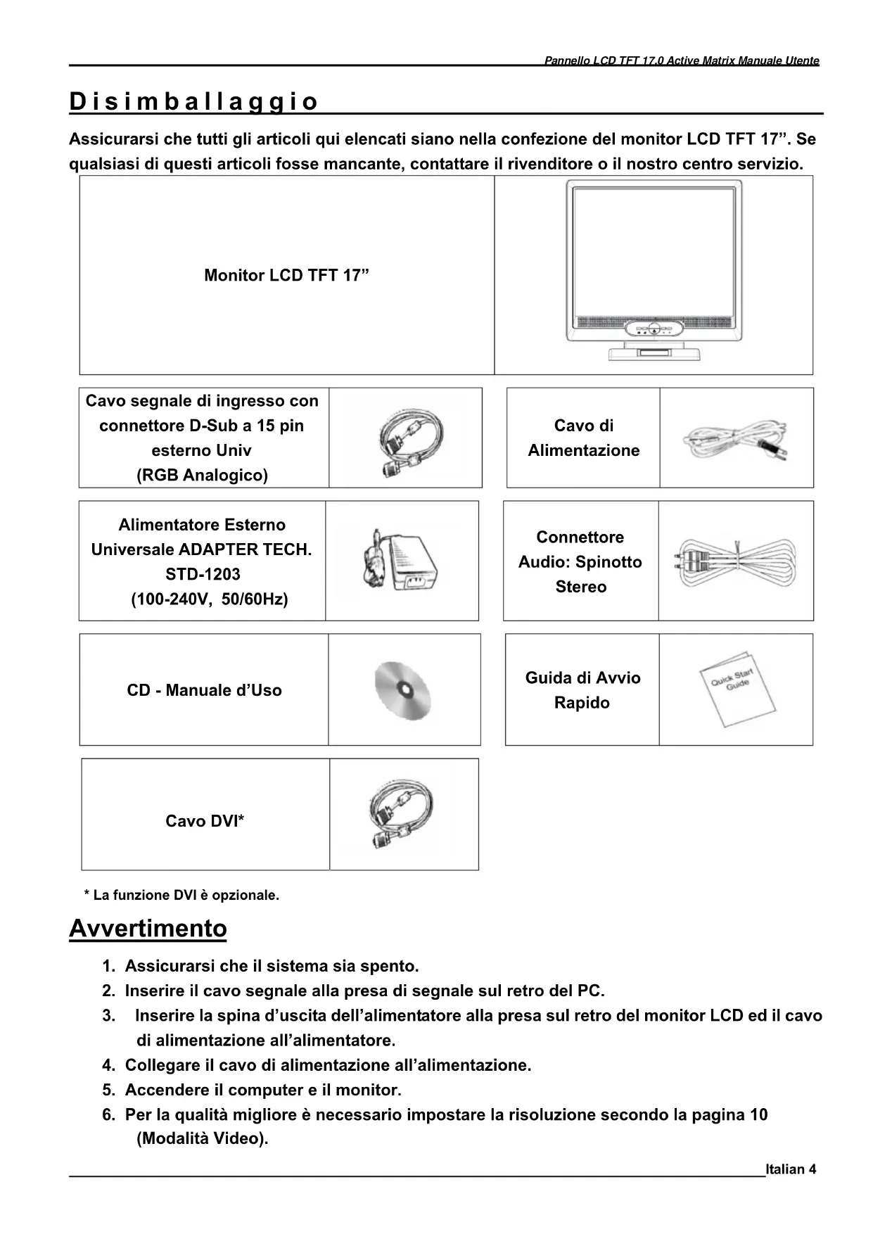 DVI* Livello Video: 0.7Vp-p(75Ω) Sync TTL con resistori di pull-up interni 75Ω Frequenza FH:30~62KHz FV:50~75Hz Supporta Segnale RGB digitale con tipo di segnalazione tipo TMDS Compatibilità PC Fino a 1280X1024@75Hz(non-interlacciato) Connettori RGB Analogico Audio Alimentazione 15 Pin D-sub Presa Stereo, Presa RCA(S/D)* Presa Alimentazione 12V/DC Alimentazione Tensione Consumo Modalità Risparmio Energetico 100-240V, 50/60Hz(universale) via Alimentatore esterno Attivo < 48 Watt Max Standby < 3 Watt Casse Incorporate 2Wx2(Stereo)Pannello LCD TFT 17.0 Active Matrix Manuale Utente Italian