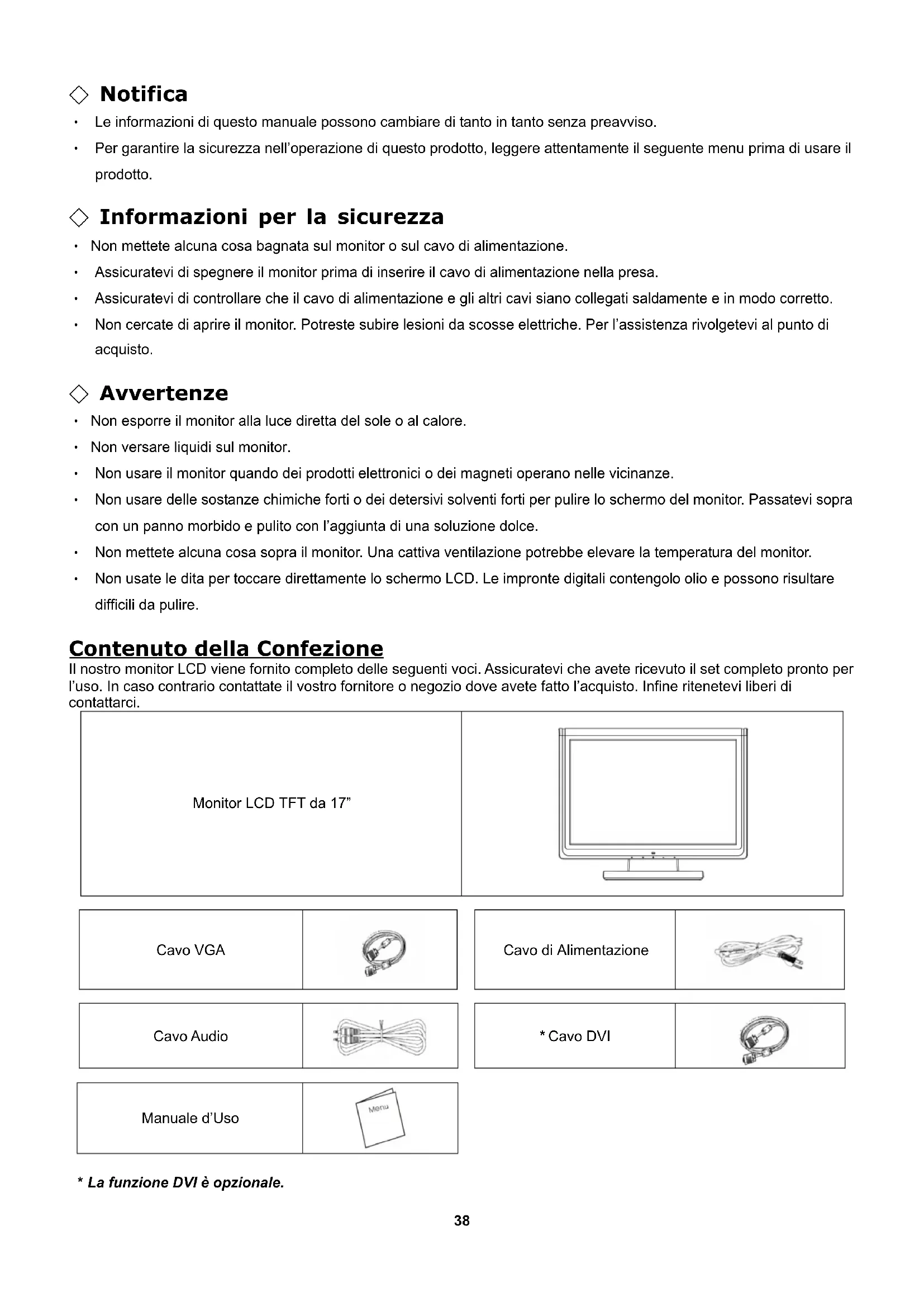- Die DVI-Funktion ist optional.37 Guida Introduttiva Notifica.…………………………………………………………………………………………………………38 Informazioni per la sicurezza…………………………………………………………………………………38 Avvertenze……………………………………………………………………………………………………..38 Contenuto della Confezione………………………………………………………………………………….38 Installazione dello Hardware………………………………………………………………………………….39 Tasti di Controllo……………………………………………………………………………………………….39 Modalita Menu OSD (On-Screen Display)………………………………………………………………40-41 Ricerca Guasti…………………………………………………………………………………………………42 Sincronizzazione Supportata…………………………………………………………………………………42 Specifiche….…………………………………………………………………………………………………...4338 ◇ Notifica ‧ Le informazioni di questo manuale possono cambiare di tanto in tanto senza preavviso. ‧ Per garantire la sicurezza nell’operazione di questo prodotto, leggere attentamente il seguente menu prima di usare il prodotto. ◇ Informazioni per la sicurezza ‧ Non mettete alcuna cosa bagnata sul monitor o sul cavo di alimentazione. ‧ Assicuratevi di spegnere il monitor prima di inserire il cavo di alimentazione nella presa. ‧ Assicuratevi di controllare che il cavo di alimentazione e gli altri cavi siano collegati saldamente e in modo corretto. ‧ Non cercate di aprire il monitor. Potreste subire lesioni da scosse elettriche. Per l’assistenza rivolgetevi al punto di acquisto. ◇ Avvertenze ‧ Non esporre il monitor alla luce diretta del sole o al calore. ‧ Non versare liquidi sul monitor. ‧ Non usare il monitor quando dei prodotti elettronici o dei magneti operano nelle vicinanze. ‧ Non usare delle sostanze chimiche forti o dei detersivi solventi forti per pulire lo schermo del monitor. Passatevi sopra con un panno morbido e pulito con l’aggiunta di una soluzione dolce. ‧ Non mettete alcuna cosa sopra il monitor. Una cattiva ventilazione potrebbe elevare la temperatura del monitor. ‧ Non usate le dita per toccare direttamente lo schermo LCD. Le impronte digitali contengolo olio e possono risultare difficili da pulire. Contenuto della Confezione Il nostro monitor LCD viene fornito completo delle seguenti voci. Assicuratevi che avete ricevuto il set completo pronto per l’uso. In caso contrario contattate il vostro fornitore o negozio dove avete fatto l’acquisto. Infine ritenetevi liberi di contattarci. Monitor LCD TFT da 17”