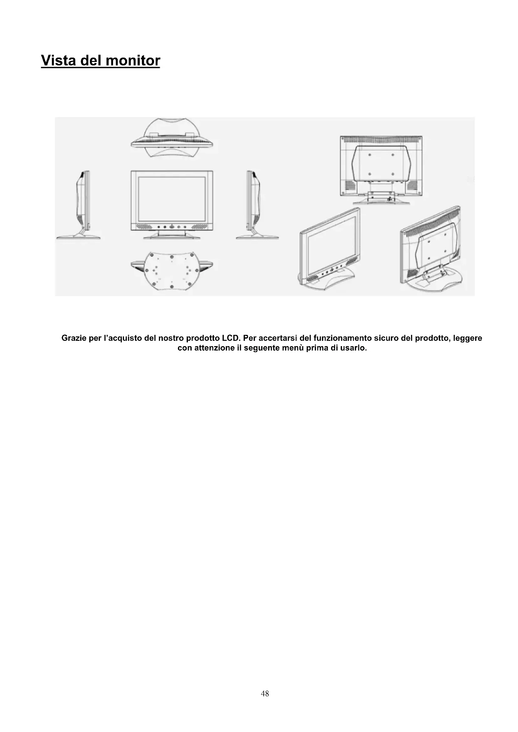 Grazie per l’acquisto del nostro prodotto LCD. Per accertarsi del funzionamento sicuro del prodotto, leggere con attenzione il seguente menù prima di usarlo.49 Apertura della confezione Il nostro monitor 15” LCD viene fornito con i seguenti accessori. Controllate di averli tutti, altrimenti contattate il rivenditore o il negozio dove avete comprato l’apparecchio. Se lo ritenete opportuno, contattateci direttamente. Monitor LCD 15” TFT