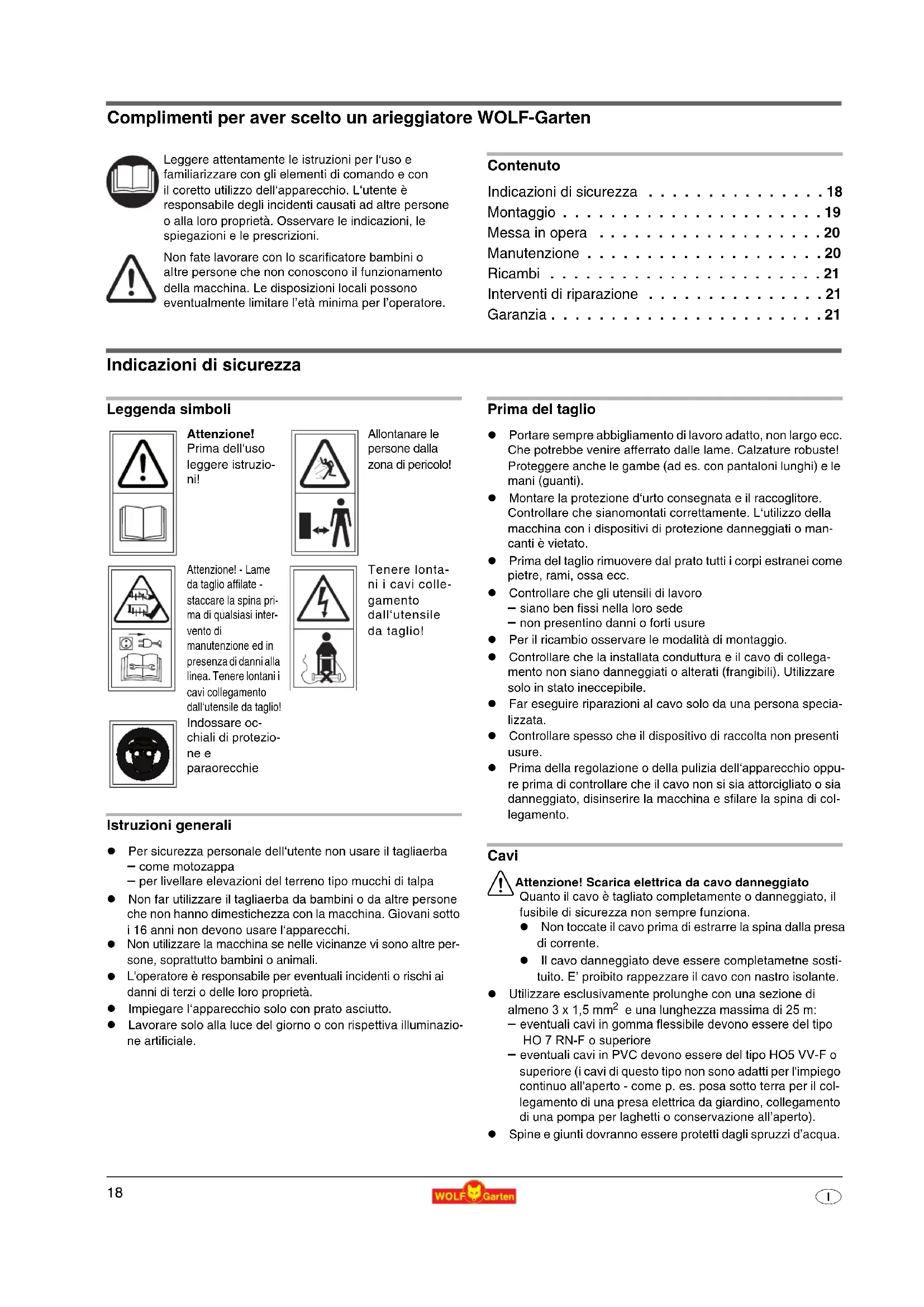 I Complimenti per aver scelto un arieggiatore WOLF-Garten Contenuto Indicazioni di sicurezza . . . . . . . . . . . . . . . 18 Montaggio