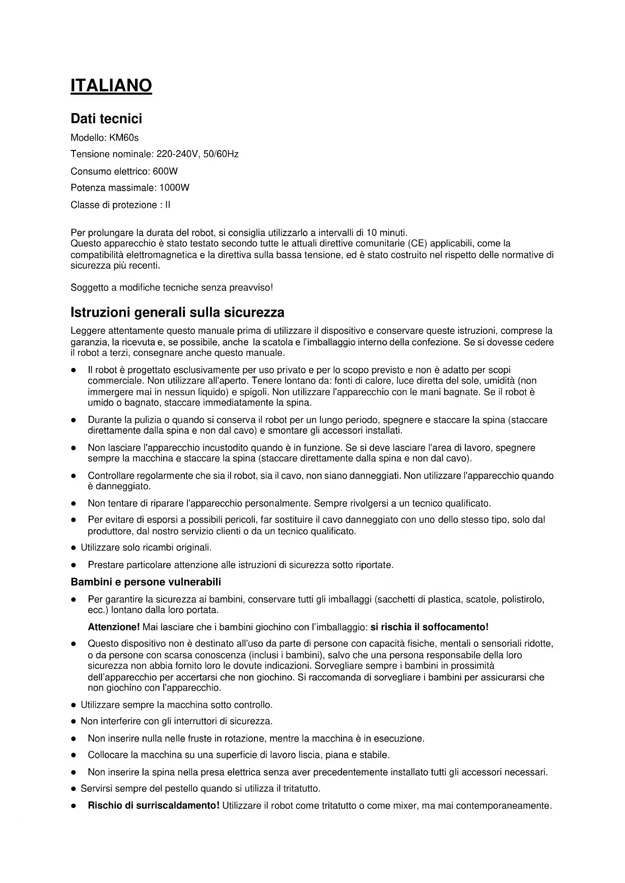 Fabricado e importado por: Adeva SAS 8 rue Marc Seguin 77290 Mitry-Mory FRANCE www.hkoenig.com - contact@hkoenig.com - Tel. 01 64 67 00 01ITALIANO Dati tecnici Modello: KM60s Tensione nominale: 220-240V, 50/60Hz Consumo elettrico: 600W Potenza massimale: 1000W Classe di protezione : II Per prolungare la durata del robot, si consiglia utilizzarlo a intervalli di 10 minuti. Questo apparecchio è stato testato secondo tutte le attuali direttive comunitarie (CE) applicabili, come la compatibilità elettromagnetica e la direttiva sulla bassa tensione, ed è stato costruito nel rispetto delle normative di sicurezza più recenti. Soggetto a modifiche tecniche senza preavviso! Istruzioni generali sulla sicurezza Leggere attentamente questo manuale prima di utilizzare il dispositivo e conservare queste istruzioni, comprese la garanzia, la ricevuta e, se possibile, anche la scatola e l’imballaggio interno della confezione. Se si dovesse cedere il robot a terzi, consegnare anche questo manuale. Il robot è progettato esclusivamente per uso privato e per lo scopo previsto e non è adatto per scopi commerciale. Non utilizzare all'aperto. Tenere lontano da: fonti di calore, luce diretta del sole, umidità (non immergere mai in nessun liquido) e spigoli. Non utilizzare l'apparecchio con le mani bagnate. Se il robot è umido o bagnato, staccare immediatamente la spina. Durante la pulizia o quando si conserva il robot per un lungo periodo, spegnere e staccare la spina (staccare direttamente dalla spina e non dal cavo) e smontare gli accessori installati. Non lasciare l'apparecchio incustodito quando è in funzione. Se si deve lasciare l'area di lavoro, spegnere sempre la macchina e staccare la spina (staccare direttamente dalla spina e non dal cavo). Controllare regolarmente che sia il robot, sia il cavo, non siano danneggiati. Non utilizzare l'apparecchio quando è danneggiato. Non tentare di riparare l'apparecchio personalmente. Sempre rivolgersi a un tecnico qualificato. Per evitare di esporsi a possibili pericoli, far sostituire il cavo danneggiato con uno dello stesso tipo, solo dal produttore, dal nostro servizio clienti o da un tecnico qualificato. Utilizzare solo ricambi originali. Prestare particolare attenzione alle istruzioni di sicurezza sotto riportate. Bambini e persone vulnerabili Per garantire la sicurezza ai bambini, conservare tutti gli imballaggi (sacchetti di plastica, scatole, polistirolo, ecc.) lontano dalla loro portata. Attenzione! Mai lasciare che i bambini giochino con l’imballaggio: si rischia il soffocamento! Questo dispositivo non è destinato all'uso da parte di persone con capacità fisiche, mentali o sensoriali ridotte, o da persone con scarsa conoscenza (inclusi i bambini), salvo che una persona responsabile della loro sicurezza non abbia fornito loro le dovute indicazioni. Sorvegliare sempre i bambini in prossimità dell’apparecchio per accertarsi che non giochino. Si raccomanda di sorvegliare i bambini per assicurarsi che non giochino con l'apparecchio. Utilizzare sempre la macchina sotto controllo. Non interferire con gli interruttori di sicurezza. Non inserire nulla nelle fruste in rotazione, mentre la macchina è in esecuzione. Collocare la macchina su una superficie di lavoro liscia, piana e stabile. Non inserire la spina nella presa elettrica senza aver precedentemente installato tutti gli accessori necessari. Servirsi sempre del pestello quando si utilizza il tritatutto. Rischio di surriscaldamento! Utilizzare il robot come tritatutto o come mixer, ma mai contemporaneamente.Descrizione dei componenti