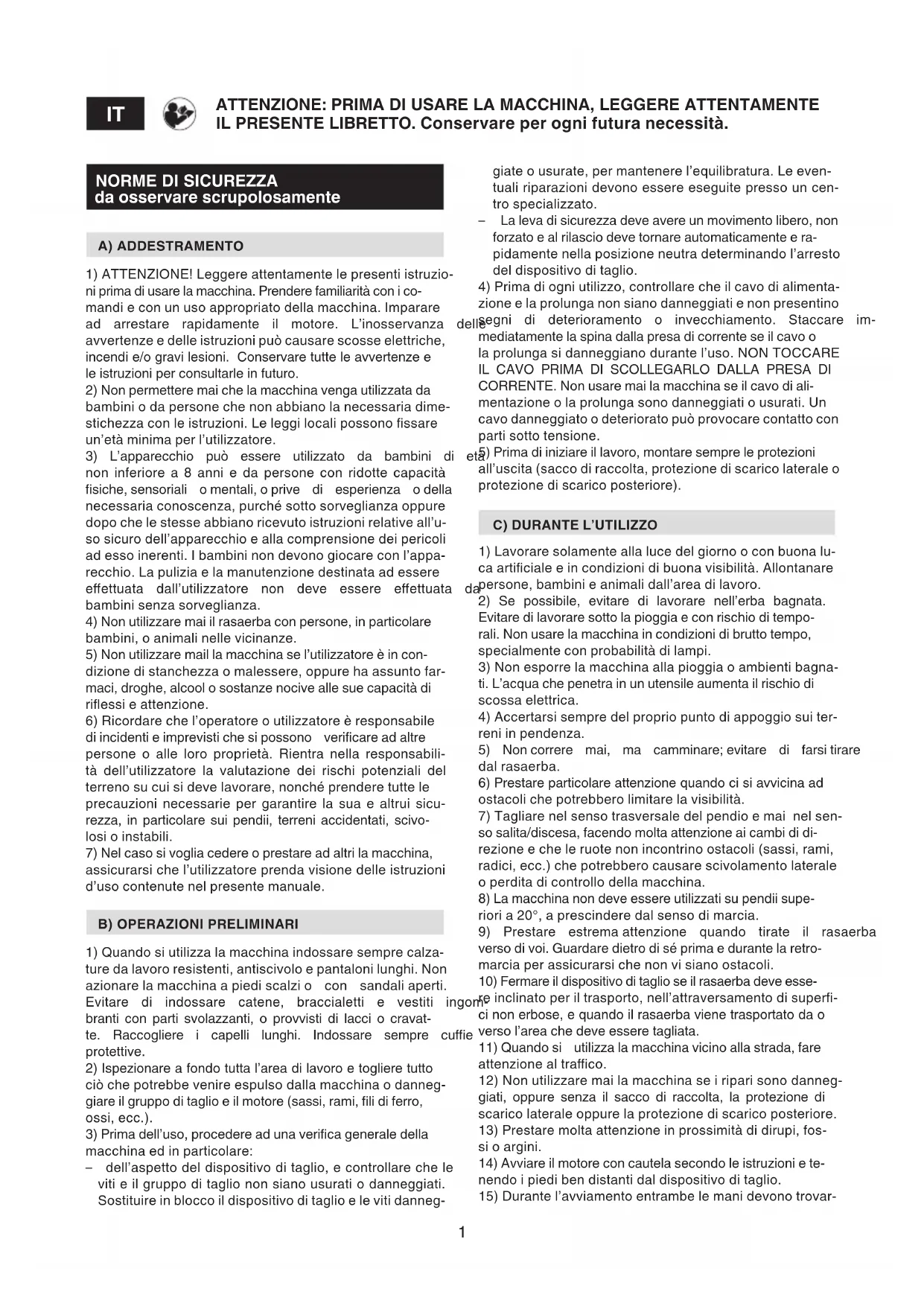 ATTENZIONE: PRIMA DI USARE LA MACCHINA, LEGGERE ATTENTAMENTE IL PRESENTE LIBRETTO. Conservare per ogni futura necessità. giate o usurate, per mantenere l’equilibratura. Le even- tuali riparazioni devono essere eseguite presso un cen- tro specializzato. – La leva di sicurezza deve avere un movimento libero, non forzato e al rilascio deve tornare automaticamente e ra- pidamente nella posizione neutra determinando l’arresto del dispositivo di taglio. 4) Prima di ogni utilizzo, controllare che il cavo di alimenta- zione e la prolunga non siano danneggiati e non presentino segni di deterioramento o invecchiamento. Staccare im- mediatamente la spina dalla presa di corrente se il cavo o la prolunga si danneggiano durante l’uso. NON TOCCARE IL CAVO PRIMA DI SCOLLEGARLO DALLA PRESA DI CORRENTE. Non usare mai la macchina se il cavo di ali- mentazione o la prolunga sono danneggiati o usurati. Un cavo danneggiato o deteriorato può provocare contatto con parti sotto tensione. 5) Prima di iniziare il lavoro, montare sempre le protezioni all’uscita (sacco di raccolta, protezione di scarico laterale o protezione di scarico posteriore).