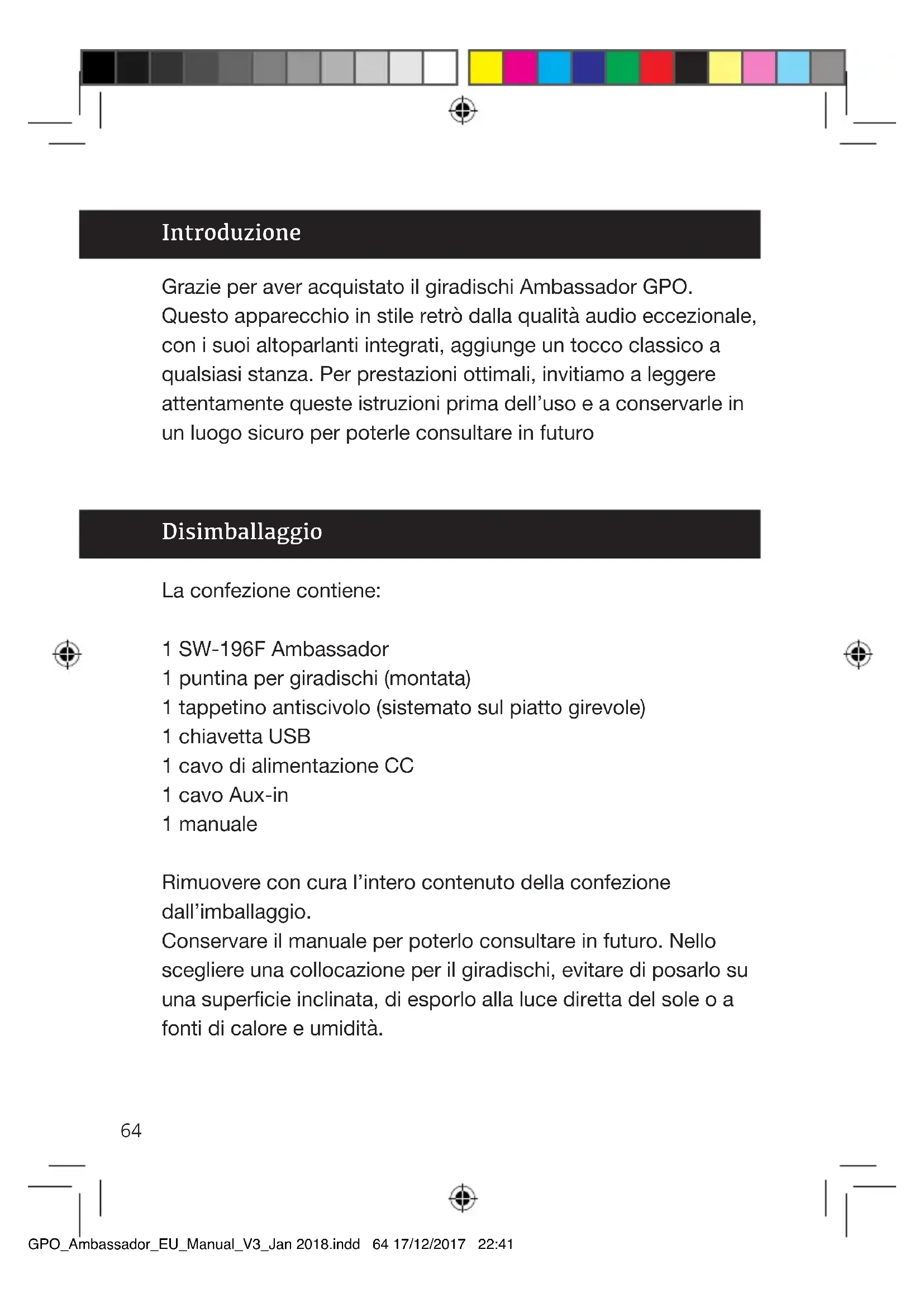 GPO_Ambassador_EU_Manual_V3_Jan 2018.indd 63 17/12/2017 22:4164 Introduzione Grazie per aver acquistato il giradischi Ambassador GPO. Questo apparecchio in stile retrò dalla qualità audio eccezionale, con i suoi altoparlanti integrati, aggiunge un tocco classico a qualsiasi stanza. Per prestazioni ottimali, invitiamo a leggere attentamente queste istruzioni prima dell’uso e a conservarle in un luogo sicuro per poterle consultare in futuro La confezione contiene: 1 SW-196F Ambassador 1 puntina per giradischi (montata) 1 tappetino antiscivolo (sistemato sul piatto girevole) 1 chiavetta USB 1 cavo di alimentazione CC 1 cavo Aux-in 1 manuale Rimuovere con cura l’intero contenuto della confezione dall’imballaggio. Conservare il manuale per poterlo consultare in futuro. Nello scegliere una collocazione per il giradischi, evitare di posarlo su una superficie inclinata, di esporlo alla luce diretta del sole o a fonti di calore e umidità. Disimballaggio GPO_Ambassador_EU_Manual_V3_Jan 2018.indd 64 17/12/2017 22:4165 Caratteristiche Il giradischi Ambassador presenta le seguenti caratteristiche: