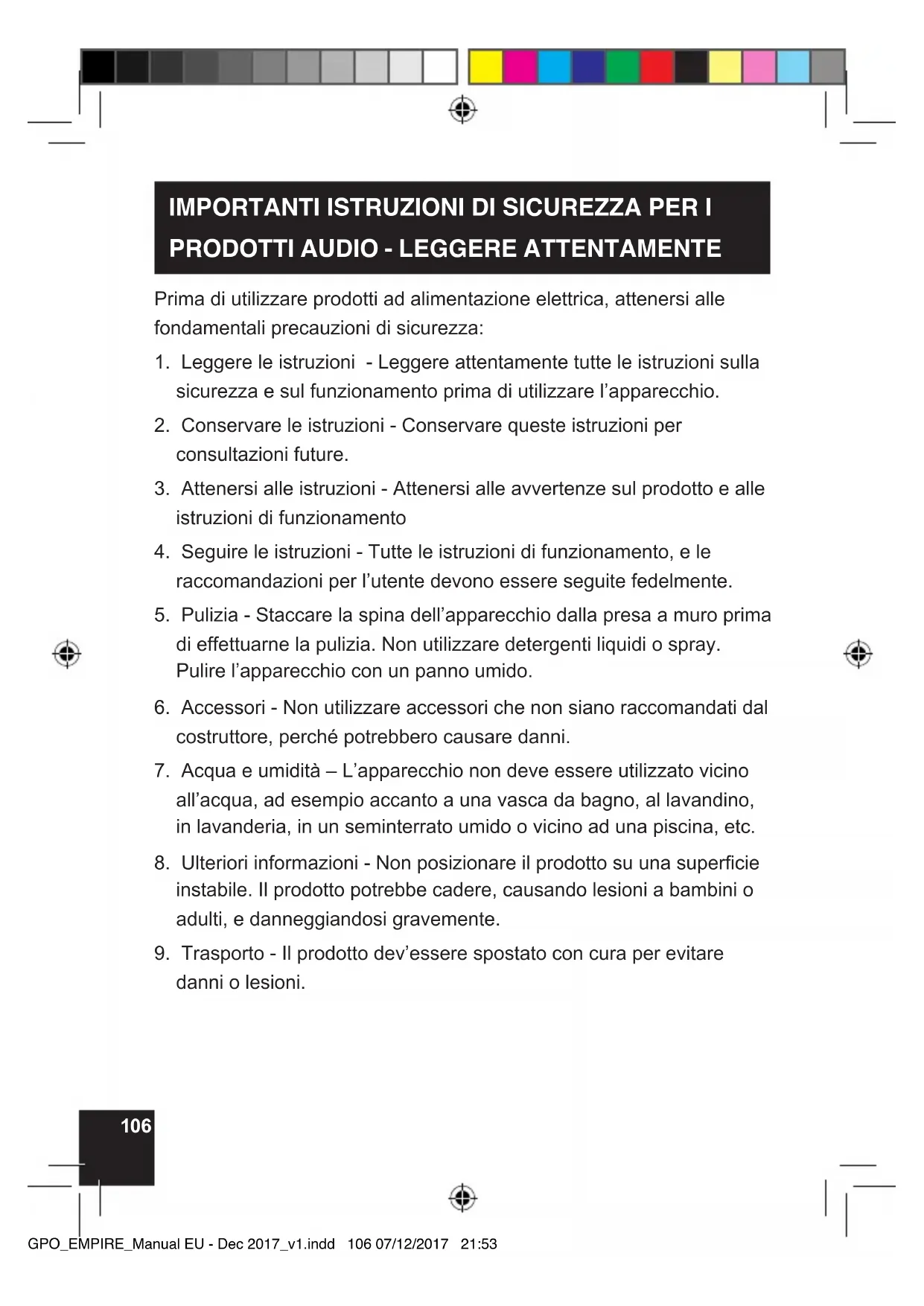 come termosifoni, radiatori termici, stufe o altri apparecchi (inclusi amplicatori) che generano calore. GPO_EMPIRE_Manual EU - Dec 2017_v1.indd 108 07/12/2017 21:53109 PRECAUZIONI Informazioni sulla sicurezza - Attenzione: