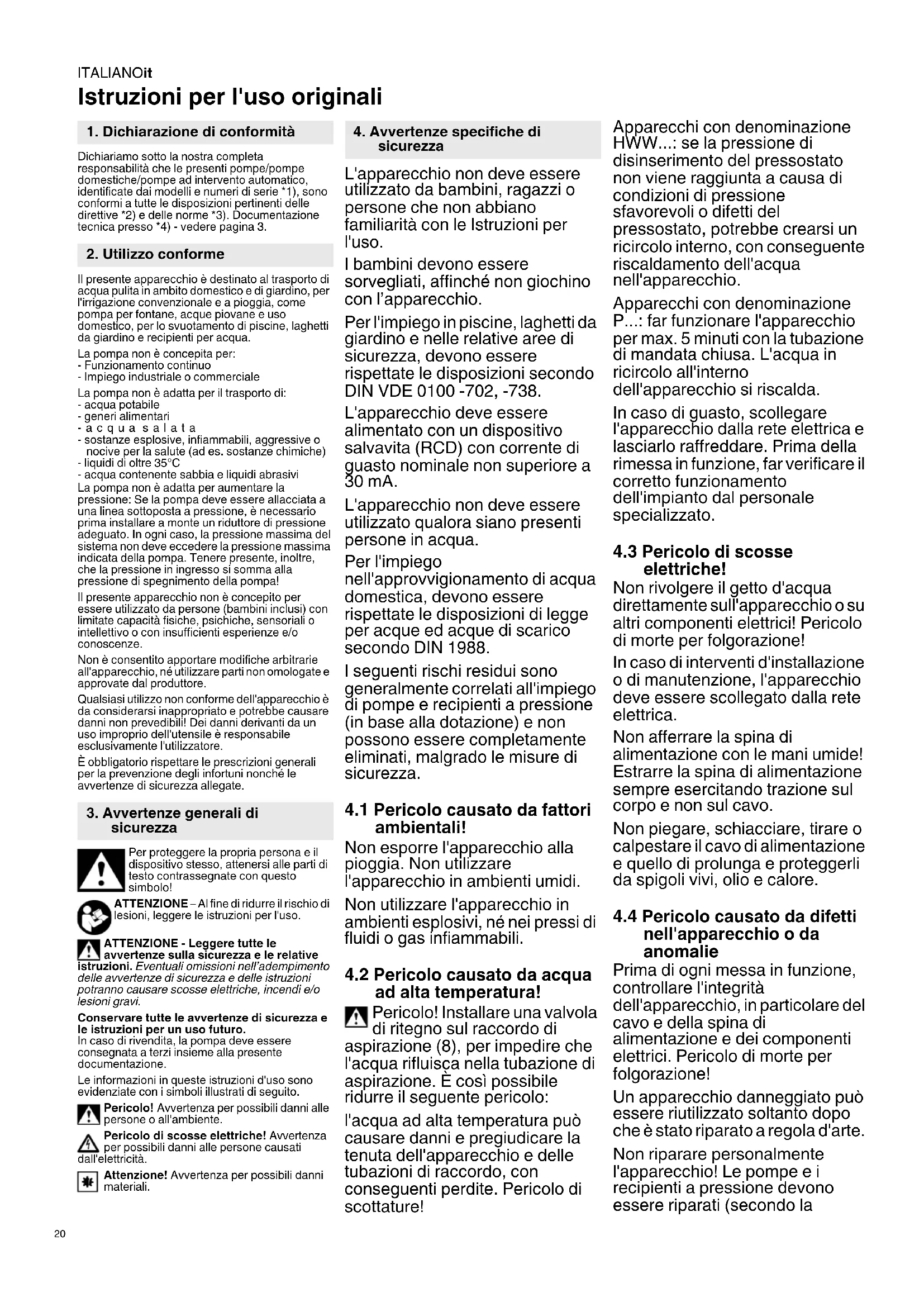 Istruzioni per l'uso originali Dichiariamo sotto la nostra completa responsabilità che le presenti pompe/pompe domestiche/pompe ad intervento automatico, identificate dai modelli e numeri di serie *1), sono conformi a tutte le disposizioni pertinenti delle direttive *2) e delle norme *3). Documentazione tecnica presso *4) - vedere pagina 3. Il presente apparecchio è destinato al trasporto di acqua pulita in ambito domestico e di giardino, per l'irrigazione convenzionale e a pioggia, come pompa per fontane, acque piovane e uso domestico, per lo svuotamento di piscine, laghetti da giardino e recipienti per acqua. La pompa non è concepita per: - Funzionamento continuo - Impiego industriale o commerciale La pompa non è adatta per il trasporto di: - acqua potabile - generi alimentari -acqua salata - sostanze esplosive, infiammabili, aggressive o nocive per la salute (ad es. sostanze chimiche) - liquidi di oltre 35°C - acqua contenente sabbia e liquidi abrasivi La pompa non è adatta per aumentare la pressione: Se la pompa deve essere allacciata a una linea sottoposta a pressione, è necessario prima installare a monte un riduttore di pressione adeguato. In ogni caso, la pressione massima del sistema non deve eccedere la pressione massima indicata della pompa. Tenere presente, inoltre, che la pressione in ingresso si somma alla pressione di spegnimento della pompa! Il presente apparecchio non è concepito per essere utilizzato da persone (bambini inclusi) con limitate capacità fisiche, psichiche, sensoriali o intellettivo o con insufficienti esperienze e/o conoscenze. Non è consentito apportare modifiche arbitrarie all'apparecchio, né utilizzare parti non omologate e approvate dal produttore. Qualsiasi utilizzo non conforme dell'apparecchio è da considerarsi inappropriato e potrebbe causare danni non prevedibili! Dei danni derivanti da un uso improprio dell'utensile è responsabile esclusivamente l'utilizzatore. È obbligatorio rispettare le prescrizioni generali per la prevenzione degli infortuni nonché le avvertenze di sicurezza allegate. Per proteggere la propria persona e il dispositivo stesso, attenersi alle parti di testo contrassegnate con questo simbolo! ATTENZIONE – Al fine di ridurre il rischio di lesioni, leggere le istruzioni per l'uso. ATTENZIONE - Leggere tutte le avvertenze sulla sicurezza e le relative istruzioni. Eventuali omissioni nell’adempimento delle avvertenze di sicurezza e delle istruzioni potranno causare scosse elettriche, incendi e/o lesioni gravi. Conservare tutte le avvertenze di sicurezza e le istruzioni per un uso futuro. In caso di rivendita, la pompa deve essere consegnata a terzi insieme alla presente documentazione. Le informazioni in queste istruzioni d'uso sono evidenziate con i simboli illustrati di seguito. Pericolo! Avvertenza per possibili danni alle persone o all'ambiente. Pericolo di scosse elettriche! Avvertenza per possibili danni alle persone causati dall'elettricità. Attenzione! Avvertenza per possibili danni materiali. L'apparecchio non deve essere utilizzato da bambini, ragazzi o persone che non abbiano familiarità con le Istruzioni per l'uso. I bambini devono essere sorvegliati, affinché non giochino con l’apparecchio. Per l'impiego in piscine, laghetti da giardino e nelle relative aree di sicurezza, devono essere rispettate le disposizioni secondo DIN VDE 0100 -702, -738. L'apparecchio deve essere alimentato con un dispositivo salvavita (RCD) con corrente di guasto nominale non superiore a 30 mA. L'apparecchio non deve essere utilizzato qualora siano presenti persone in acqua. Per l'impiego nell'approvvigionamento di acqua domestica, devono essere rispettate le disposizioni di legge per acque ed acque di scarico secondo DIN 1988. I seguenti rischi residui sono generalmente correlati all'impiego di pompe e recipienti a pressione (in base alla dotazione) e non possono essere completamente eliminati, malgrado le misure di sicurezza.