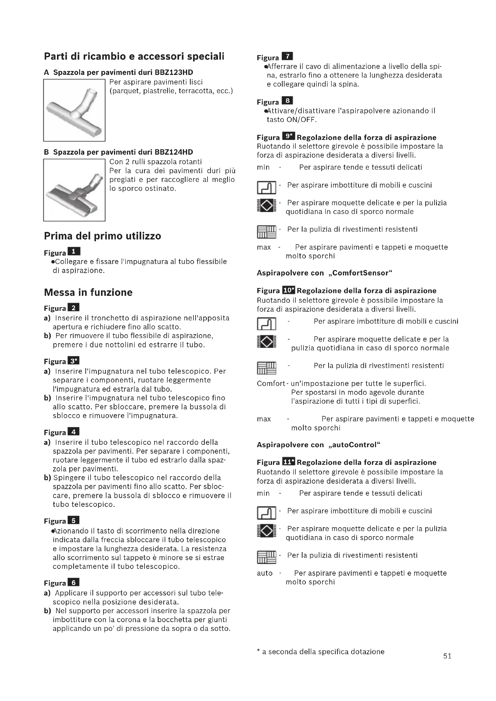 Regolazione della forza di aspirazione Ruotando il selettore girevole è possibile impostare la forza di aspirazione desiderata a diversi livelli. min - Per aspirare tende e tessuti delicati - Per aspirare imbottiture di mobili e cuscini - Per aspirare moquette delicate e per la pulizia quotidiana in caso di sporco normale - Per la pulizia di rivestimenti resistenti max - Per aspirare pavimenti e tappeti e moquette molto sporchi Aspirapolvere con „ComfortSensor“ Figura 10* Regolazione della forza di aspirazione Ruotando il selettore girevole è possibile impostare la forza di aspirazione desiderata a diversi livelli. - Per aspirare imbottiture di mobili e cuscini - Per aspirare moquette delicate e per la pulizia quotidiana in caso di sporco normale - Per la pulizia di rivestimenti resistenti Comfort - un'impostazione per tutte le superfici. Per spostarsi in modo agevole durante l'aspirazione di tutti i tipi di superfici. max - Per aspirare pavimenti e tappeti e moquette molto sporchi Aspirapolvere con „autoControl“ Figura 11* Regolazione della forza di aspirazione Ruotando il selettore girevole è possibile impostare la forza di aspirazione desiderata a diversi livelli. min - Per aspirare tende e tessuti delicati - Per aspirare imbottiture di mobili e cuscini - Per aspirare moquette delicate e per la pulizia quotidiana in caso di sporco normale - Per la pulizia di rivestimenti resistenti auto - Per aspirare pavimenti e tappeti e moquette molto sporchi52