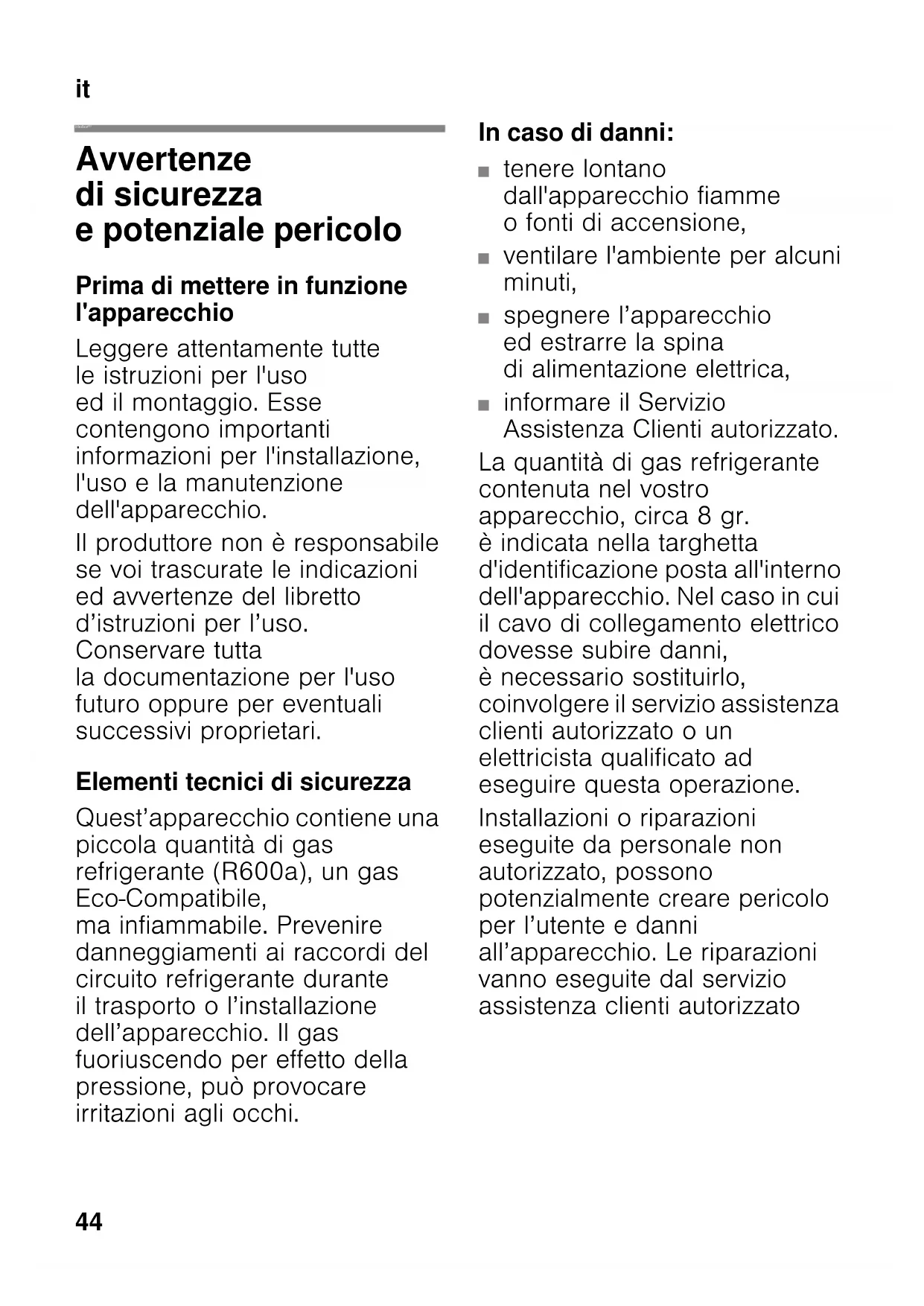 Avverenze di sicurezza e potenziale pericolo 44