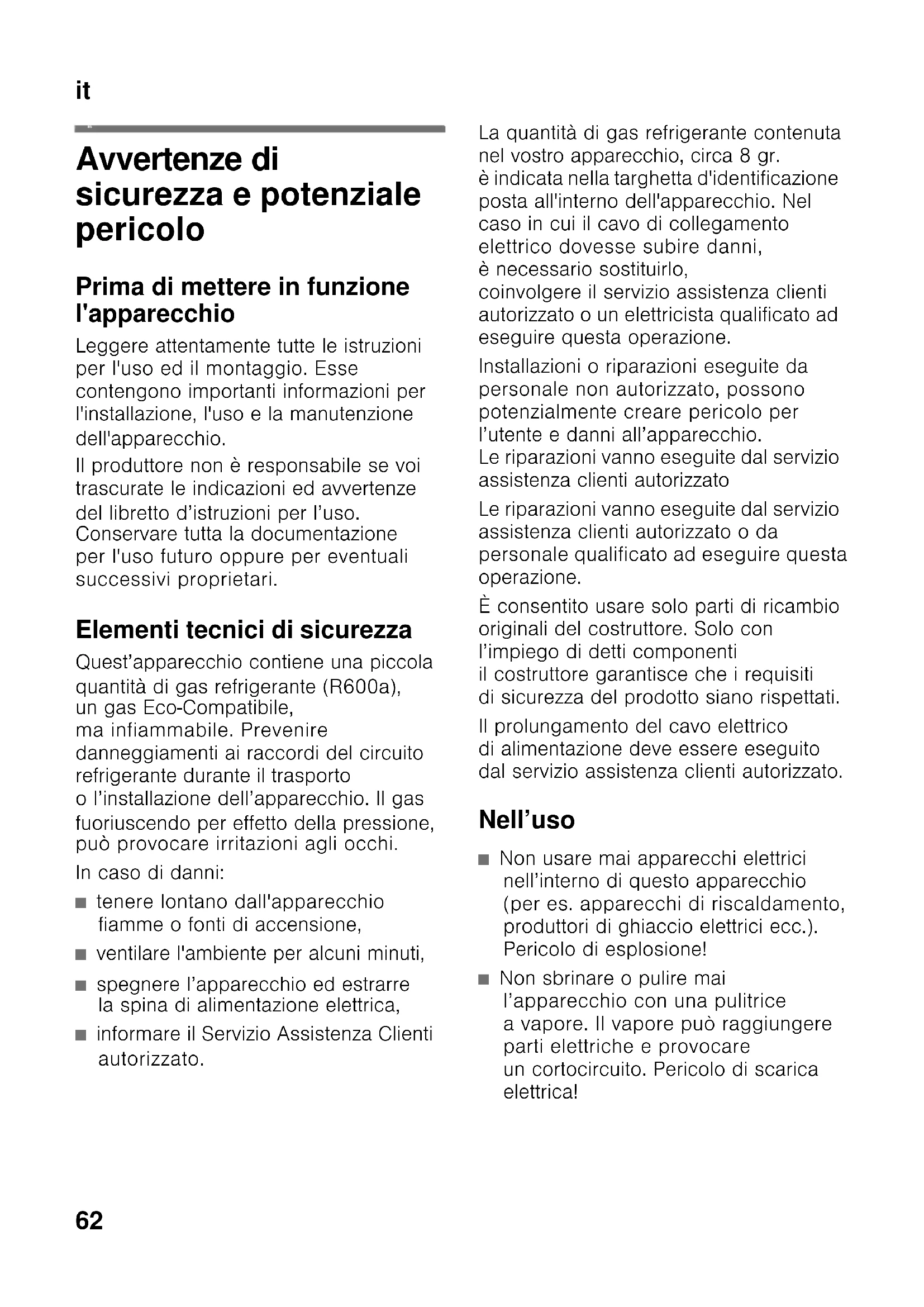 itIndic e itIs truzioni per I´ uso Avvertenze di sicurezza e potenziale pericolo Prima di mettere in funzione l'apparecchio Leggere attentamente tutte le istruzioni per l'uso ed il montaggio. Esse contengono importanti informazioni per l'installazione, l'uso e la manutenzione dell'apparecchio. Il produttore non è responsabile se voi trascurate le indicazioni ed avvertenze del libretto d’istruzioni per l’uso. Conservare tutta la documentazione per l'uso futuro oppure per eventuali successivi proprietari. Elementi tecnici di sicurezza Quest’apparecchio contiene una piccola quantità di gas refrigerante (R600a), un gas Eco-Compatibile, ma infiammabile. Prevenire danneggiamenti ai raccordi del circuito refrigerante durante il trasporto o l’installazione dell’apparecchio. Il gas fuoriuscendo per effetto della pressione, può provocare irritazioni agli occhi. In caso di danni: ■ tenere lontano dall'apparecchio fiamme o fonti di accensione, ■ ventilare l'ambiente per alcuni minuti, ■ spegnere l’apparecchio ed estrarre la spina di alimentazione elettrica, ■ informare il Servizio Assistenza Clienti autorizzato. La quantità di gas refrigerante contenuta nel vostro apparecchio, circa 8 gr. è indicata nella targhetta d'identificazione posta all'interno dell'apparecchio. Nel caso in cui il cavo di collegamento elettrico dovesse subire danni, è necessario sostituirlo, coinvolgere il servizio assistenza clienti autorizzato o un elettricista qualificato ad eseguire questa operazione. Installazioni o riparazioni eseguite da personale non autorizzato, possono potenzialmente creare pericolo per l’utente e danni all’apparecchio. Le riparazioni vanno eseguite dal servizio assistenza clienti autorizzato Le riparazioni vanno eseguite dal servizio assistenza clienti autorizzato o da personale qualificato ad eseguire questa operazione. È consentito usare solo parti di ricambio originali del costruttore. Solo con l’impiego di detti componenti il costruttore garantisce che i requisiti di sicurezza del prodotto siano rispettati. Il prolungamento del cavo elettrico di alimentazione deve essere eseguito dal servizio assistenza clienti autorizzato. Nell’uso ■ Non usare mai apparecchi elettrici nell’interno di questo apparecchio (per es. apparecchi di riscaldamento, produttori di ghiaccio elettrici ecc.). Pericolo di esplosione! ■ Non sbrinare o pulire mai l’apparecchio con una pulitrice a vapore. Il vapore può raggiungere parti elettriche e provocare un cortocircuito. Pericolo di scarica elettrica!it