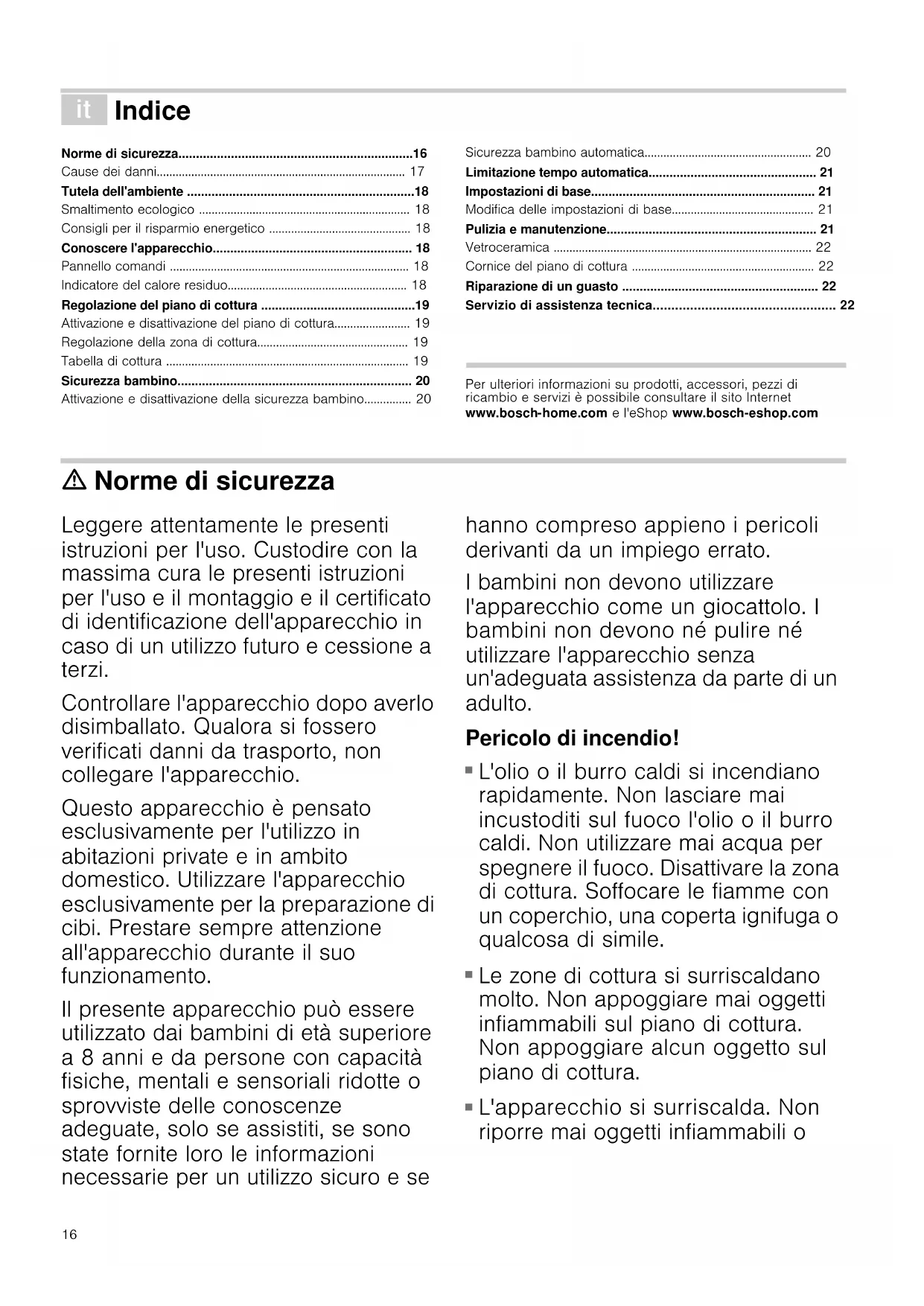 - Ne placez pas de casseroles chaudes près du bandeau de commande ou sur celui-ci B 070 222 141 FR 01 40 10 11 00 CH 0848 840 04016 â Indice [it] Istruzioni per l’uso Norme di sicurezza...................................................................16 Cause dei danni............................................................................... 17 Tutela dell'ambiente .................................................................18 Smaltimento ecologico ................................................................... 18 Consigli per il risparmio energetico ............................................. 18 Conoscere l'apparecchio......................................................... 18 Pannello comandi ............................................................................ 18 Indicatore del calore residuo......................................................... 18 Regolazione del piano di cottura ............................................19 Attivazione e disattivazione del piano di cottura........................ 19 Regolazione della zona di cottura................................................ 19 Tabella di cottura ............................................................................. 19 Sicurezza bambino................................................................... 20 Attivazione e disattivazione della sicurezza bambino............... 20 Sicurezza bambino automatica..................................................... 20 Limitazione tempo automatica................................................ 21 Impostazioni di base................................................................ 21 Modifica delle impostazioni di base............................................. 21 Pulizia e manutenzione............................................................ 21 Vetroceramica .................................................................................. 22 Cornice del piano di cottura .......................................................... 22 Riparazione di un guasto ........................................................ 22 Servizio di assistenza tecnica................................................. 22 Produktinfo Per ulteriori informazioni su prodotti, accessori, pezzi di ricambio e servizi è possibile consultare il sito Internet www.bosch-home.com e l'eShop www.bosch-eshop.com ã=Norme di sicurezza Leggere attentamente le presenti istruzioni per l'uso. Custodire con la massima cura le presenti istruzioni per l'uso e il montaggio e il certificato di identificazione dell'apparecchio in caso di un utilizzo futuro e cessione a terzi. Controllare l'apparecchio dopo averlo disimballato. Qualora si fossero verificati danni da trasporto, non collegare l'apparecchio. Questo apparecchio è pensato esclusivamente per l'utilizzo in abitazioni private e in ambito domestico. Utilizzare l'apparecchio esclusivamente per la preparazione di cibi. Prestare sempre attenzione all'apparecchio durante il suo funzionamento. Il presente apparecchio può essere utilizzato dai bambini di età superiore a 8 anni e da persone con capacità fisiche, mentali e sensoriali ridotte o sprovviste delle conoscenze adeguate, solo se assistiti, se sono state fornite loro le informazioni necessarie per un utilizzo sicuro e se hanno compreso appieno i pericoli derivanti da un impiego errato. I bambini non devono utilizzare l'apparecchio come un giocattolo. I bambini non devono né pulire né utilizzare l'apparecchio senza un'adeguata assistenza da parte di un adulto. Pericolo di incendio!