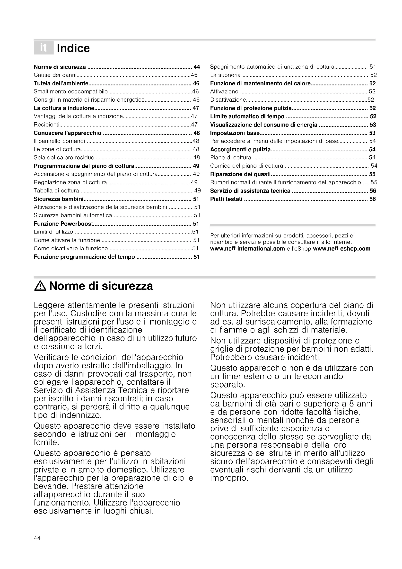 - Piatti testati Produktinfo Per ulteriori informazioni su prodotti, accessori, pezzi di ricambio e servizi è possibile consultare il sito Internet www.neff-international.com e l'eShop www.neff-eshop.com : Norme di sicurezza Leggere attentamente le presenti istruzioni per l'uso. Custodire con la massima cura le presenti istruzioni per l'uso e il montaggio e il certificato di identificazione dell'apparecchio in caso di un utilizzo futuro e cessione a terzi. Verificare le condizioni dell'apparecchio dopo averlo estratto dall'imballaggio. In caso di danni provocati dal trasporto, non collegare l'apparecchio, contattare il Servizio di Assistenza Tecnica e riportare per iscritto i danni riscontrati; in caso contrario, si perderà il diritto a qualunque tipo di indennizzo. Questo apparecchio deve essere installato secondo le istruzioni per il montaggio fornite. Questo apparecchio è pensato esclusivamente per l'utilizzo in abitazioni private e in ambito domestico. Utilizzare l'apparecchio per la preparazione di cibi e bevande. Prestare attenzione all'apparecchio durante il suo funzionamento. Utilizzare l'apparecchio esclusivamente in luoghi chiusi. Non utilizzare alcuna copertura del piano di cottura. Potrebbe causare incidenti, dovuti ad es. al surriscaldamento, alla formazione di fiamme o agli schizzi di materiale. Non utilizzare dispositivi di protezione o griglie di protezione per bambini non adatti. Potrebbero causare incidenti. Questo apparecchio non è da utilizzare con un timer esterno o un telecomando separato. Questo apparecchio può essere utilizzato da bambini di età pari o superiore a 8 anni e da persone con ridotte facoltà fisiche, sensoriali o mentali nonché da persone prive di sufficiente esperienza o conoscenza dello stesso se sorvegliate da una persona responsabile della loro sicurezza o se istruite in merito all'utilizzo sicuro dell'apparecchio e consapevoli degli eventuali rischi derivanti da un utilizzo improprio.45 I bambini non devono utilizzare l'apparecchio come un giocattolo. I bambini non devono né pulire né utilizzare l'apparecchio da soli a meno che non abbiano un'età superiore agli 8 anni e che siano assistiti da parte di un adulto. Tenere lontano dall'apparecchio e dal cavo di alimentazione i bambini di età inferiore agli 8 anni. Le persone che hanno subito l'impianto di un pace-maker o di un dispositivo medico simile devono fare particolarmente attenzione quando utilizzano o si avvicinano ai piani di cottura ad induzione. Consultare il medico o il fabbricante del dispositivo per assicurarsi che sia conforme alla normativa vigente e per informarsi sulle possibili incompatibilità. Pericolo di incendio! p. 56