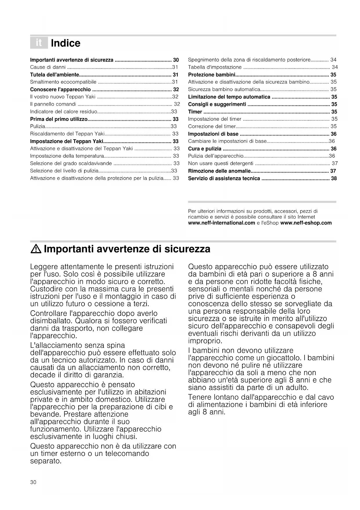 - Servizio di assistenza tecnica Produktinfo Per ulteriori informazioni su prodotti, accessori, pezzi di ricambio e servizi è possibile consultare il sito Internet www.neff-international.com e l'eShop www.neff-eshop.com : Importanti avvertenze di sicurezza Leggere attentamente le presenti istruzioni per l'uso. Solo così è possibile utilizzare l'apparecchio in modo sicuro e corretto. Custodire con la massima cura le presenti istruzioni per l'uso e il montaggio in caso di un utilizzo futuro o cessione a terzi. Controllare l'apparecchio dopo averlo disimballato. Qualora si fossero verificati danni da trasporto, non collegare l'apparecchio. L'allacciamento senza spina dell'apparecchio può essere effettuato solo da un tecnico autorizzato. In caso di danni causati da un allacciamento non corretto, decade il diritto di garanzia. Questo apparecchio è pensato esclusivamente per l'utilizzo in abitazioni private e in ambito domestico. Utilizzare l'apparecchio per la preparazione di cibi e bevande. Prestare attenzione all'apparecchio durante il suo funzionamento. Utilizzare l'apparecchio esclusivamente in luoghi chiusi. Questo apparecchio non è da utilizzare con un timer esterno o un telecomando separato. Questo apparecchio può essere utilizzato da bambini di età pari o superiore a 8 anni e da persone con ridotte facoltà fisiche, sensoriali o mentali nonché da persone prive di sufficiente esperienza o conoscenza dello stesso se sorvegliate da una persona responsabile della loro sicurezza o se istruite in merito all'utilizzo sicuro dell'apparecchio e consapevoli degli eventuali rischi derivanti da un utilizzo improprio. I bambini non devono utilizzare l'apparecchio come un giocattolo. I bambini non devono né pulire né utilizzare l'apparecchio da soli a meno che non abbiano un'età superiore agli 8 anni e che siano assistiti da parte di un adulto. Tenere lontano dall'apparecchio e dal cavo di alimentazione i bambini di età inferiore agli 8 anni.31 Pericolo di incendio! p. 38