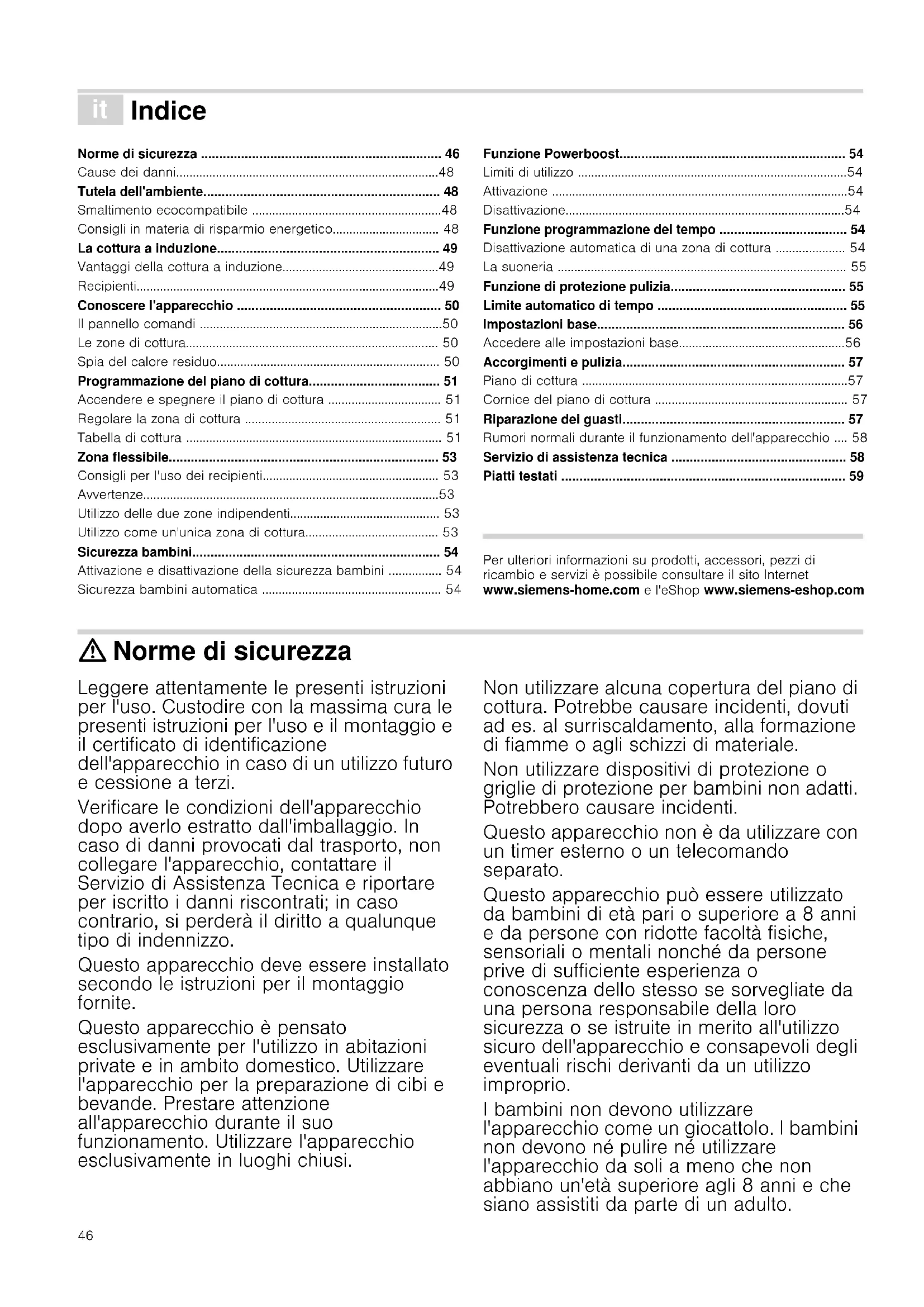 - Piatti testati Produktinfo Per ulteriori informazioni su prodotti, accessori, pezzi di ricambio e servizi è possibile consultare il sito Internet www.siemens-home.com e l'eShop www.siemens-eshop.com : Norme di sicurezza Leggere attentamente le presenti istruzioni per l'uso. Custodire con la massima cura le presenti istruzioni per l'uso e il montaggio e il certificato di identificazione dell'apparecchio in caso di un utilizzo futuro e cessione a terzi. Verificare le condizioni dell'apparecchio dopo averlo estratto dall'imballaggio. In caso di danni provocati dal trasporto, non collegare l'apparecchio, contattare il Servizio di Assistenza Tecnica e riportare per iscritto i danni riscontrati; in caso contrario, si perderà il diritto a qualunque tipo di indennizzo. Questo apparecchio deve essere installato secondo le istruzioni per il montaggio fornite. Questo apparecchio è pensato esclusivamente per l'utilizzo in abitazioni private e in ambito domestico. Utilizzare l'apparecchio per la preparazione di cibi e bevande. Prestare attenzione all'apparecchio durante il suo funzionamento. Utilizzare l'apparecchio esclusivamente in luoghi chiusi. Non utilizzare alcuna copertura del piano di cottura. Potrebbe causare incidenti, dovuti ad es. al surriscaldamento, alla formazione di fiamme o agli schizzi di materiale. Non utilizzare dispositivi di protezione o griglie di protezione per bambini non adatti. Potrebbero causare incidenti. Questo apparecchio non è da utilizzare con un timer esterno o un telecomando separato. Questo apparecchio può essere utilizzato da bambini di età pari o superiore a 8 anni e da persone con ridotte facoltà fisiche, sensoriali o mentali nonché da persone prive di sufficiente esperienza o conoscenza dello stesso se sorvegliate da una persona responsabile della loro sicurezza o se istruite in merito all'utilizzo sicuro dell'apparecchio e consapevoli degli eventuali rischi derivanti da un utilizzo improprio. I bambini non devono utilizzare l'apparecchio come un giocattolo. I bambini non devono né pulire né utilizzare l'apparecchio da soli a meno che non abbiano un'età superiore agli 8 anni e che siano assistiti da parte di un adulto.47 Tenere lontano dall'apparecchio e dal cavo di alimentazione i bambini di età inferiore agli 8 anni. Le persone che hanno subito l'impianto di un pace-maker o di un dispositivo medico simile devono fare particolarmente attenzione quando utilizzano o si avvicinano ai piani di cottura ad induzione. Consultare il medico o il fabbricante del dispositivo per assicurarsi che sia conforme alla normativa vigente e per informarsi sulle possibili incompatibilità. Pericolo di incendio! p. 59