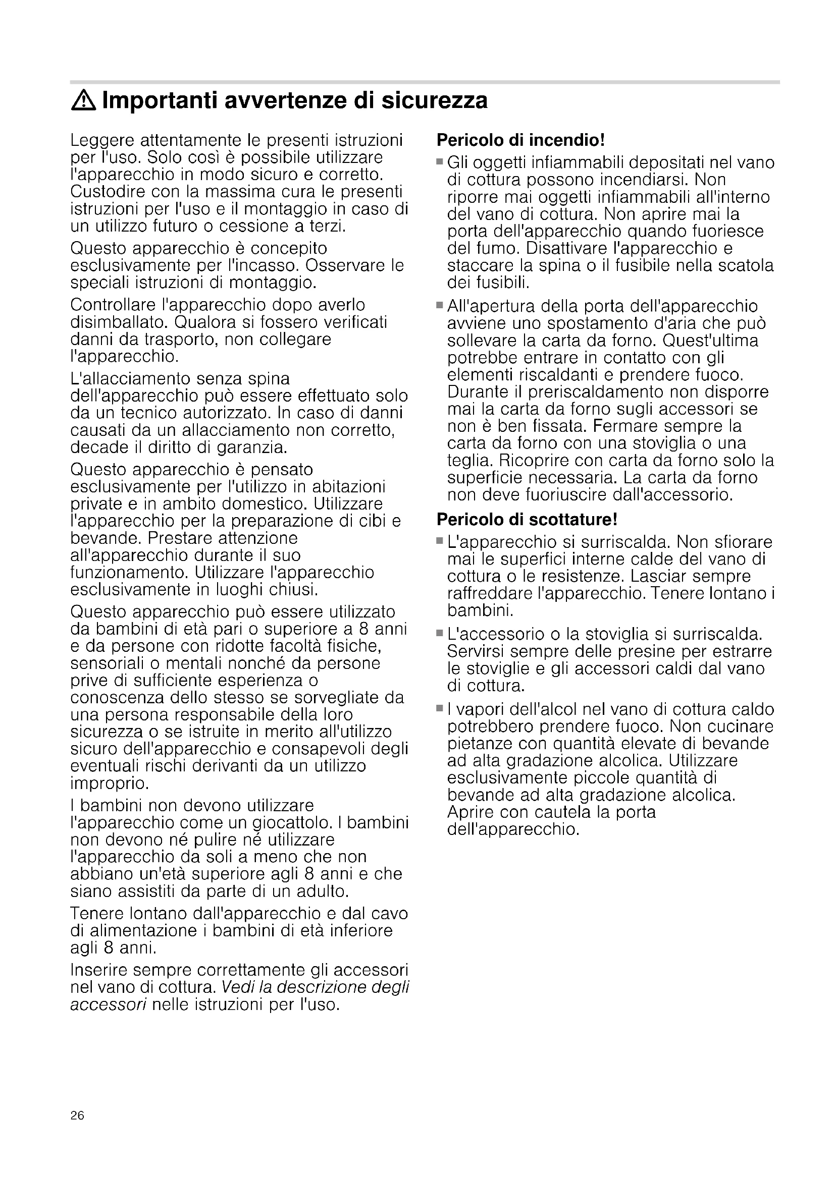 I vapori dell'alcol nel vano di cottura caldo potrebbero prendere fuoco. Non cucinare pietanze con quantità elevate di bevande ad alta gradazione alcolica. Utilizzare esclusivamente piccole quantità di bevande ad alta gradazione alcolica. Aprire con cautela la porta dell'apparecchio.27 Pericolo di scottature!