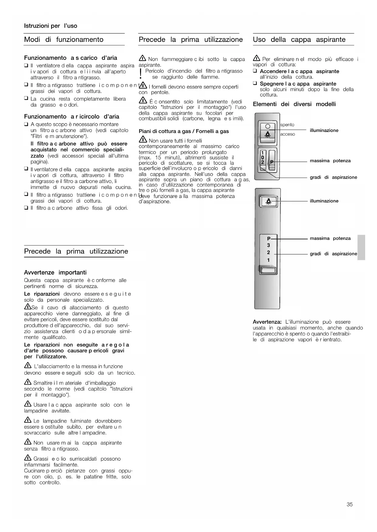 ventilatoredella cappa aspirante aspiraivapori di cottura, attraverso il filtro antigrasso eilfiltroacarbone attivo, li immette di nuovo depurati nella cucina. Il filtroantigrasso trattiene icomponentigrassi dei vapori di cottura. Il filtroacarbone attivo fissa gli odori. Precede la prima utilizzazione Avvertenze importanti Questa cappa aspirante èconforme allepertinenti norme di sicurezza.Le riparazioni devono essereeseguitesolo da personale specializzato. Se il cavo di allacciamento di questo apparecchio viene danneggiato, al fine di evitarepericoli, deve esseresostituito dal produttoredell'apparecchio, dal suo servi-zio assistenza clienti odapersonale simil-mente qualificato.Le riparazioni non eseguite aregolad'arte possono causarepericoli graviper l'utilizzatore. L'allacciamento elamessa in funzione devono essereeseguiti solo da un tecnico. Smaltireilmateriale d'imballaggio secondo le norme (vedi capitolo "Istruzioniper il montaggio"). Usarelacappa aspirante solo con le lampadine avvitate. Le lampadine fulminate dovrebbero esseresostituite subito, per evitareunsovraccario sulle altrelampadine. Non usaremai la cappa aspirante senza filtroantigrasso. Grassi eolio surriscaldati possono infiammarsi facilmente.Cucinareperciò pietanze con grassi oppu-re con olio, p. es. le patatine fritte, solosotto controllo. Non fiammeggiarecibi sotto la cappa aspirante.Pericolo d'incendio del filtroantigrasso ! se raggiunto delle fiamme. Ifornelli devono esseresemprecoperti con pentole. Éconsentito solo limitatamente (vedi capitolo "Istruzioni per il montaggio") l'usodella cappa aspirante su focolari percombustibilisolidi (carbone, legna esimili). Piani di cottura agas /Fornelli agas Non usaretutti ifornelli contemporaneamente al massimo caricotermico per un periodo prolungato(max. 15 minuti), altrimenti sussiste ilpericolo di scottature, se si tocca lasuperficiedell’involucroopericolo di dannialla cappa aspirante. Nell’uso della cappaaspirante sopra un piano di cottura agas,in caso d’utilizzazione contemporanea di treopiù fornelli agas, la cappa aspirante deve funzionarealla massima potenzad’aspirazione. Modi di funzionamento Istruzioni per l’uso Precede la prima utilizzazione Per eliminarenel modo più efficace i vapori di cottura: Accenderelacappa aspiranteall'inizio della cottura. Spegnerelacappa aspirantesolo alcuni minuti dopo la fine dellacottura. Elementi dei diversi modelli Avvertenza: L'illuminazione può essereusata in qualsiasi momento, anche quando l'apparecchio èspento oquando l'estraibi- le di aspirazione vapori èrientrato.