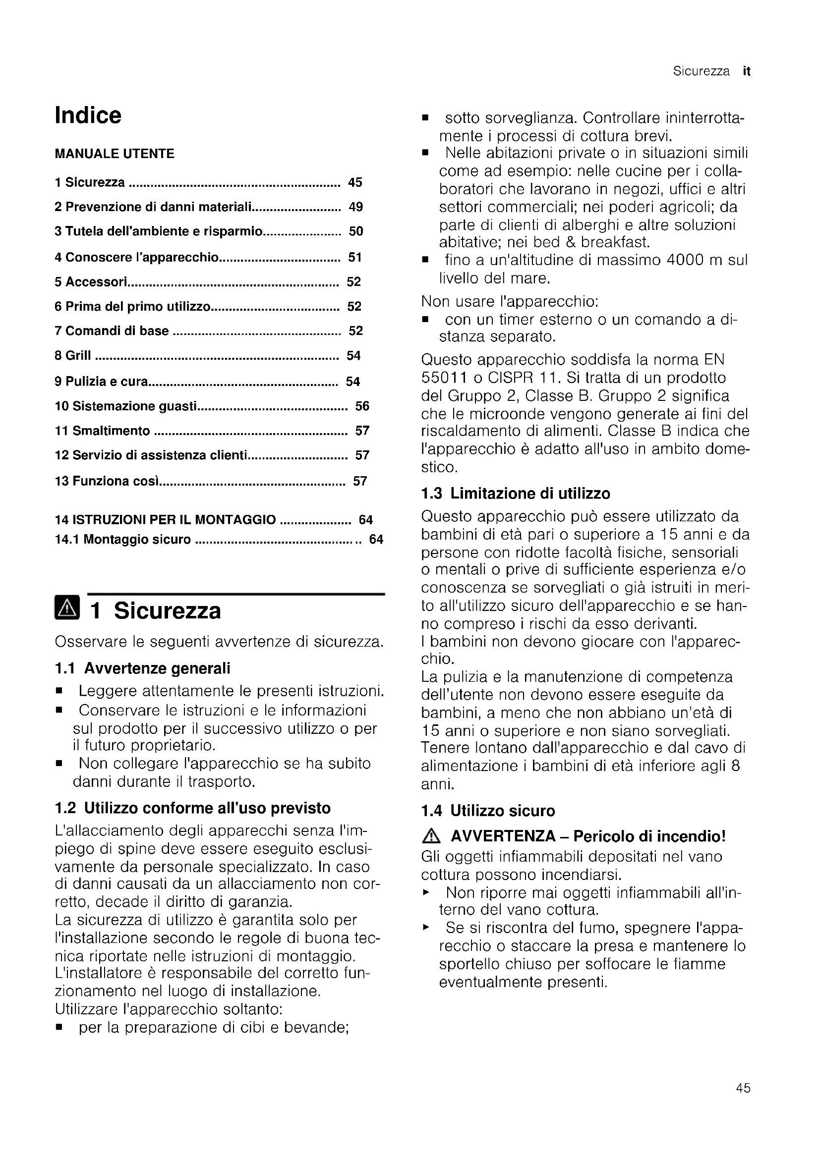 1 Sicurezza Osservare le seguenti avvertenze di sicurezza. 1.1 Avvertenze generali ¡ Leggere attentamente le presenti istruzioni. ¡ Conservare le istruzioni e le informazioni sul prodotto per il successivo utilizzo o per il futuro proprietario. ¡ Non collegare l'apparecchio se ha subito danni durante il trasporto. 1.2 Utilizzo conforme all'uso previsto L'allacciamento degli apparecchi senza l'im- piego di spine deve essere eseguito esclusi- vamente da personale specializzato. In caso di danni causati da un allacciamento non cor- retto, decade il diritto di garanzia. La sicurezza di utilizzo è garantita solo per l'installazione secondo le regole di buona tec- nica riportate nelle istruzioni di montaggio. L'installatore è responsabile del corretto fun- zionamento nel luogo di installazione. Utilizzare l'apparecchio soltanto: ¡ per la preparazione di cibi e bevande; ¡ sotto sorveglianza. Controllare ininterrotta- mente i processi di cottura brevi. ¡ Nelle abitazioni private o in situazioni simili come ad esempio: nelle cucine per i colla- boratori che lavorano in negozi, uffici e altri settori commerciali; nei poderi agricoli; da parte di clienti di alberghi e altre soluzioni abitative; nei bed & breakfast. ¡ fino a un'altitudine di massimo 4000m sul livello del mare. Non usare l'apparecchio: ¡ con un timer esterno o un comando a di- stanza separato. Questo apparecchio soddisfa la norma EN 55011 o CISPR 11. Si tratta di un prodotto del Gruppo 2, Classe B. Gruppo 2 significa che le microonde vengono generate ai fini del riscaldamento di alimenti. Classe B indica che l'apparecchio è adatto all'uso in ambito dome- stico. 1.3 Limitazione di utilizzo Questo apparecchio può essere utilizzato da bambini di età pari o superiore a 15 anni e da persone con ridotte facoltà fisiche, sensoriali o mentali o prive di sufficiente esperienza e/o conoscenza se sorvegliati o già istruiti in meri- to all'utilizzo sicuro dell'apparecchio e se han- no compreso i rischi da esso derivanti. I bambini non devono giocare con l'apparec- chio. La pulizia e la manutenzione di competenza dell’utente non devono essere eseguite da bambini, a meno che non abbiano un’età di 15 anni o superiore e non siano sorvegliati. Tenere lontano dall'apparecchio e dal cavo di alimentazione i bambini di età inferiore agli 8 anni. 1.4 Utilizzo sicuro AVVERTENZA‒Pericolo di incendio! Gli oggetti infiammabili depositati nel vano cottura possono incendiarsi. ▶ Non riporre mai oggetti infiammabili all'in- terno del vano cottura. ▶ Se si riscontra del fumo, spegnere l'appa- recchio o staccare la presa e mantenere lo sportello chiuso per soffocare le fiamme eventualmente presenti.it Sicurezza