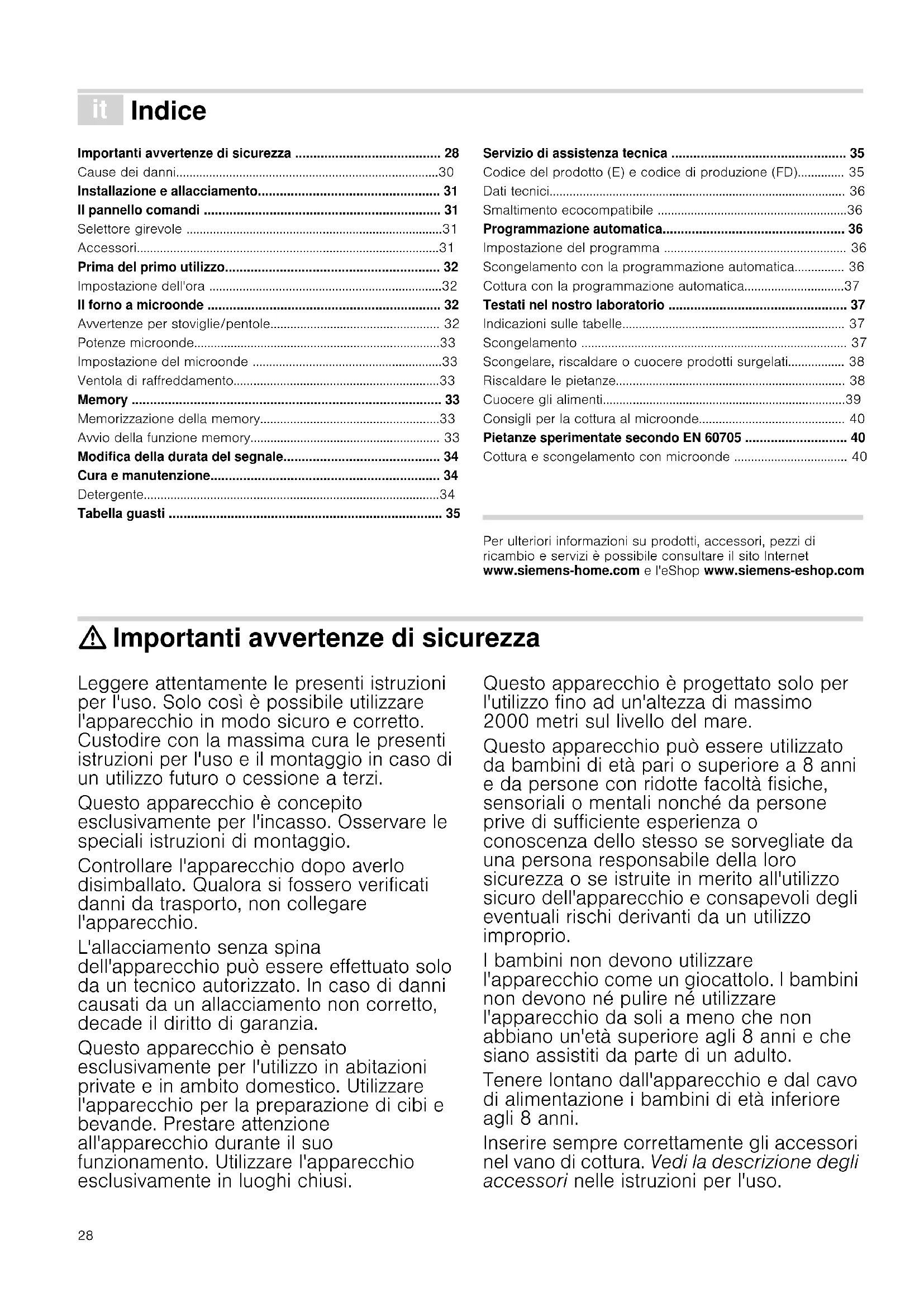 - Garen en ontdooien met de magnetron Produktinfo Meer informatie over producten, accessoires, onderdelen en diensten vindt u op het internet: www.siemens-home.com en in de online-shop: www.siemens-eshop.com : Belangrijke veiligheidsvoorschriften Lees deze gebruiksaanwijzing zorgvuldig door. Alleen dan kunt u uw apparaat goed en veilig bedienen. Bewaar de gebruiksaanwijzing voor later gebruik of om door te geven aan een volgende eigenaar. Dit apparaat is alleen bestemd voor inbouw. Neem het speciale installatievoorschrift in acht. Controleer het apparaat na het uitpakken. Niet aansluiten in geval van transportschade. Alleen een daartoe bevoegd vakman mag apparaten zonder stekker aansluiten. Bij schade door een verkeerde aansluiting maakt u geen aanspraak op garantie. Dit apparaat is alleen bestemd voor huishoudelijk gebruik en de huiselijke omgeving. Gebruik het uitsluitend voor het bereiden van gerechten en drank. Zorg ervoor dat het apparaat onder toezicht gebruikt wordt. Het toestel alleen gebruiken in gesloten ruimtes. Dit apparaat is bestemd voor gebruik tot op hoogten van maximaal 2.000 meter boven zeeniveau. Dit toestel kan worden gebruikt door kinderen vanaf 8 jaar en door personen met beperkte fysieke, sensorische of geestelijke vermogens of personen die gebrek aan kennis of ervaring hebben, wanneer zij onder toezicht staan van een persoon die verantwoordelijk is voor hun veiligheid of geleerd hebben het op een veilige manier te gebruiken en zich bewust zijn van de risico's die het gebruik van het toestel met zich meebrengt. Kinderen mogen niet met het apparaat spelen. Reiniging en onderhoud van het toestel mogen niet worden uitgevoerd door kinderen, tenzij zij 8 jaar of ouder zijn en onder toezicht staan. Zorg ervoor dat kinderen die jonger zijn dan 8 jaar uit de buurt blijven van het toestel of de aansluitkabel. Toebehoren altijd op de juiste manier in de binnenruimte plaatsen. Zie beschrijving toebehoren in de gebruiksaanwijzing. Risico van brand! p. 53