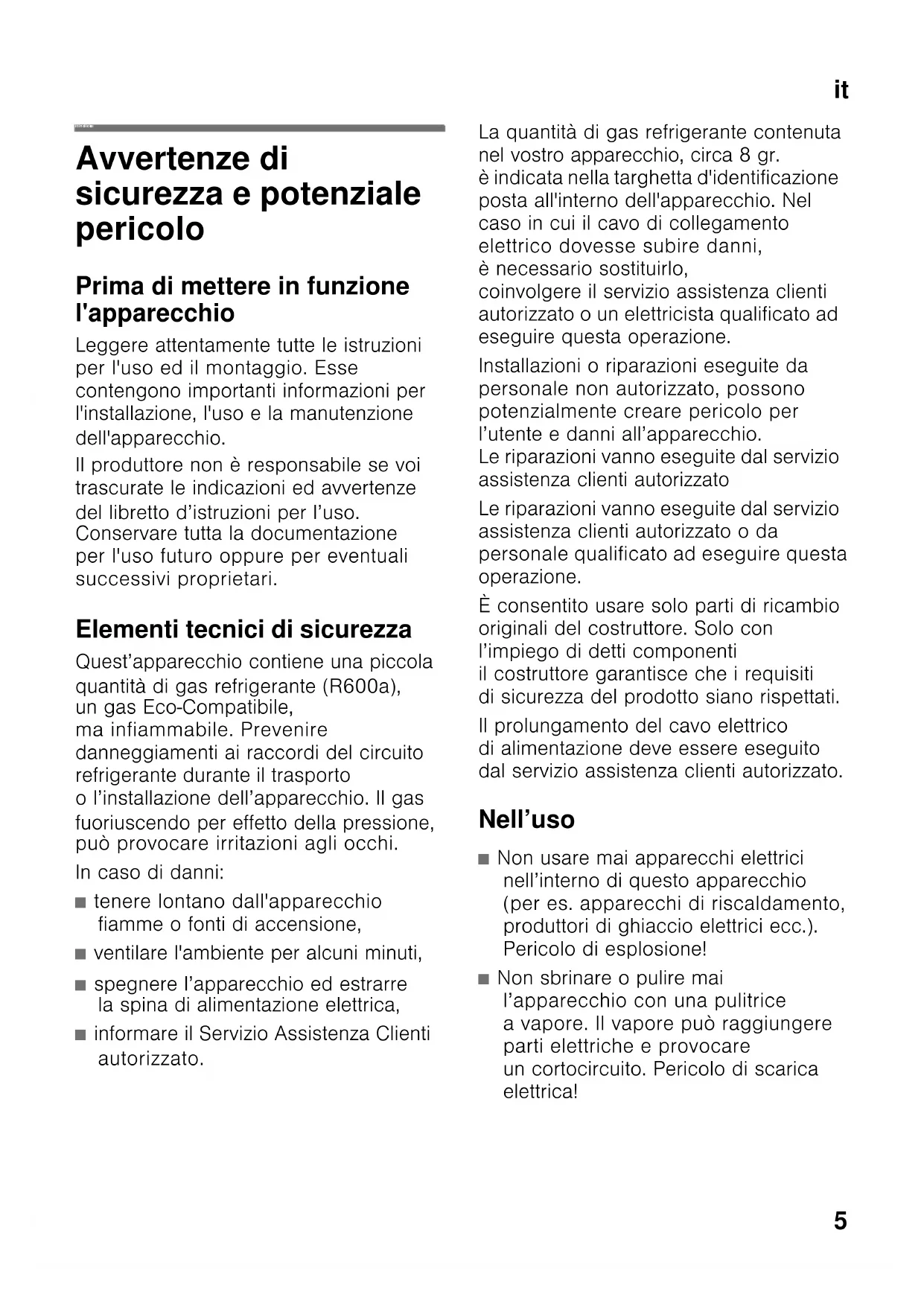 itIndice itIstruzioni per I´ uso Avvertenze di sicurezza e potenziale pericolo Prima di mettere in funzione l'apparecchio Leggere attentamente tutte le istruzioni per l'uso ed il montaggio. Esse contengono importanti informazioni per l'installazione, l'uso e la manutenzione dell'apparecchio. Il produttore non è responsabile se voi trascurate le indicazioni ed avvertenze del libretto d’istruzioni per l’uso. Conservare tutta la documentazione per l'uso futuro oppure per eventuali successivi proprietari. Elementi tecnici di sicurezza Quest’apparecchio contiene una piccola quantità di gas refrigerante (R600a), un gas Eco-Compatibile, ma infiammabile. Prevenire danneggiamenti ai raccordi del circuito refrigerante durante il trasporto o l’installazione dell’apparecchio. Il gas fuoriuscendo per effetto della pressione, può provocare irritazioni agli occhi. In caso di danni: ■ tenere lontano dall'apparecchio fiamme o fonti di accensione, ■ ventilare l'ambiente per alcuni minuti, ■ spegnere l’apparecchio ed estrarre la spina di alimentazione elettrica, ■ informare il Servizio Assistenza Clienti autorizzato. La quantità di gas refrigerante contenuta nel vostro apparecchio, circa 8 gr. è indicata nella targhetta d'identificazione posta all'interno dell'apparecchio. Nel caso in cui il cavo di collegamento elettrico dovesse subire danni, è necessario sostituirlo, coinvolgere il servizio assistenza clienti autorizzato o un elettricista qualificato ad eseguire questa operazione. Installazioni o riparazioni eseguite da personale non autorizzato, possono potenzialmente creare pericolo per l’utente e danni all’apparecchio. Le riparazioni vanno eseguite dal servizio assistenza clienti autorizzato Le riparazioni vanno eseguite dal servizio assistenza clienti autorizzato o da personale qualificato ad eseguire questa operazione. È consentito usare solo parti di ricambio originali del costruttore. Solo con l’impiego di detti componenti il costruttore garantisce che i requisiti di sicurezza del prodotto siano rispettati. Il prolungamento del cavo elettrico di alimentazione deve essere eseguito dal servizio assistenza clienti autorizzato. Nell’uso ■ Non usare mai apparecchi elettrici nell’interno di questo apparecchio (per es. apparecchi di riscaldamento, produttori di ghiaccio elettrici ecc.). Pericolo di esplosione! ■ Non sbrinare o pulire mai l’apparecchio con una pulitrice a vapore. Il vapore può raggiungere parti elettriche e provocare un cortocircuito. Pericolo di scarica elettrica!it
