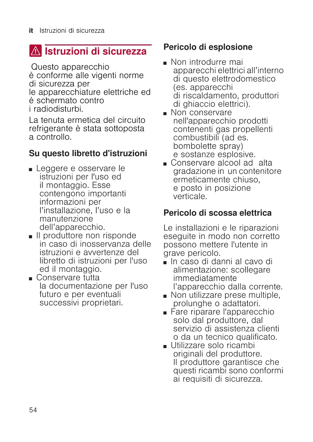 ( Istruzioni di sicurezza Istruzioni di si cur ezza Questo apparecchio è conforme alle vigenti norme di sicurezza per le apparecchiature elettriche ed è schermato contro i radiodisturbi. La tenuta ermetica del circuito refrigerante è stata sottoposta a controllo. Su questo libretto d'istruzioni ■ Leggere e osservare le istruzioni per l'uso ed il montaggio. Esse contengono importanti informazioni per l’installazione, l’uso e la manutenzione dell’apparecchio. ■ Il produttore non risponde in caso di inosservanza delle istruzioni e avvertenze del libretto di istruzioni per l'uso ed il montaggio. ■ Conservare tutta la documentazione per l'uso futuro e per eventuali successivi proprietari. Pericolo di esplosione ■ Non introdurre mai apparecchi elettrici all’interno di questo elettrodomestico (es. apparecchi di riscaldamento, produttori di ghiaccio elettrici). ■ Non conservare nell'apparecchio prodotti contenenti gas propellenti combustibili (ad es. bombolette spray) e sostanze esplosive. ■ Conservare alcool ad alta gradazione in un contenitore ermeticamente chiuso, e posto in posizione verticale. Pericolo di scossa elettrica Le installazioni e le riparazioni eseguite in modo non corretto possono mettere l'utente in grave pericolo. ■ In caso di danni al cavo di alimentazione: scollegare immediatamente l’apparecchio dalla corrente. ■ Non utilizzare prese multiple, prolunghe o adattatori. ■ Fare riparare l'apparecchio solo dal produttore, dal servizio di assistenza clienti o da un tecnico qualificato. ■ Utilizzare solo ricambi originali del produttore. Il produttore garantisce che questi ricambi sono conformi ai requisiti di sicurezza.Istruzioni di sicurezza it